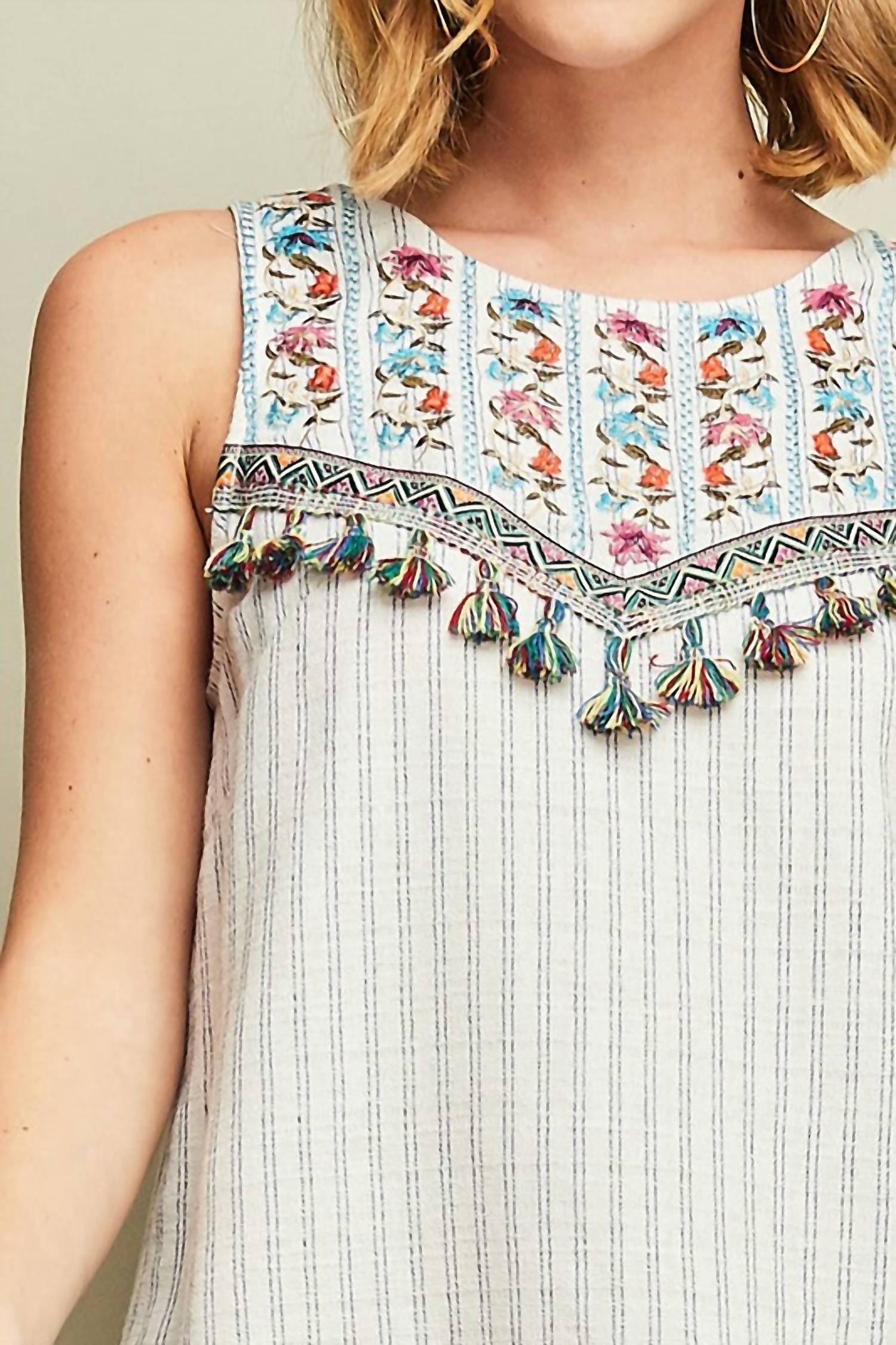 Короткое и воздушное платье для теплых дней. Представляем мини-платье с вышитыми кисточками от Entro - эффектное дополнение к любому женскому гардеробу. Это платье без рукавов имеет облегающий силуэт и фактурный узор, который подчеркивает его классический стиль. Удобная застежка-липучка, круглый вырез и игривые развевающиеся кисточки создают поистине уникальный образ. Это мини-платье универсального белого цвета идеально подходит для коктейльных вечеринок.