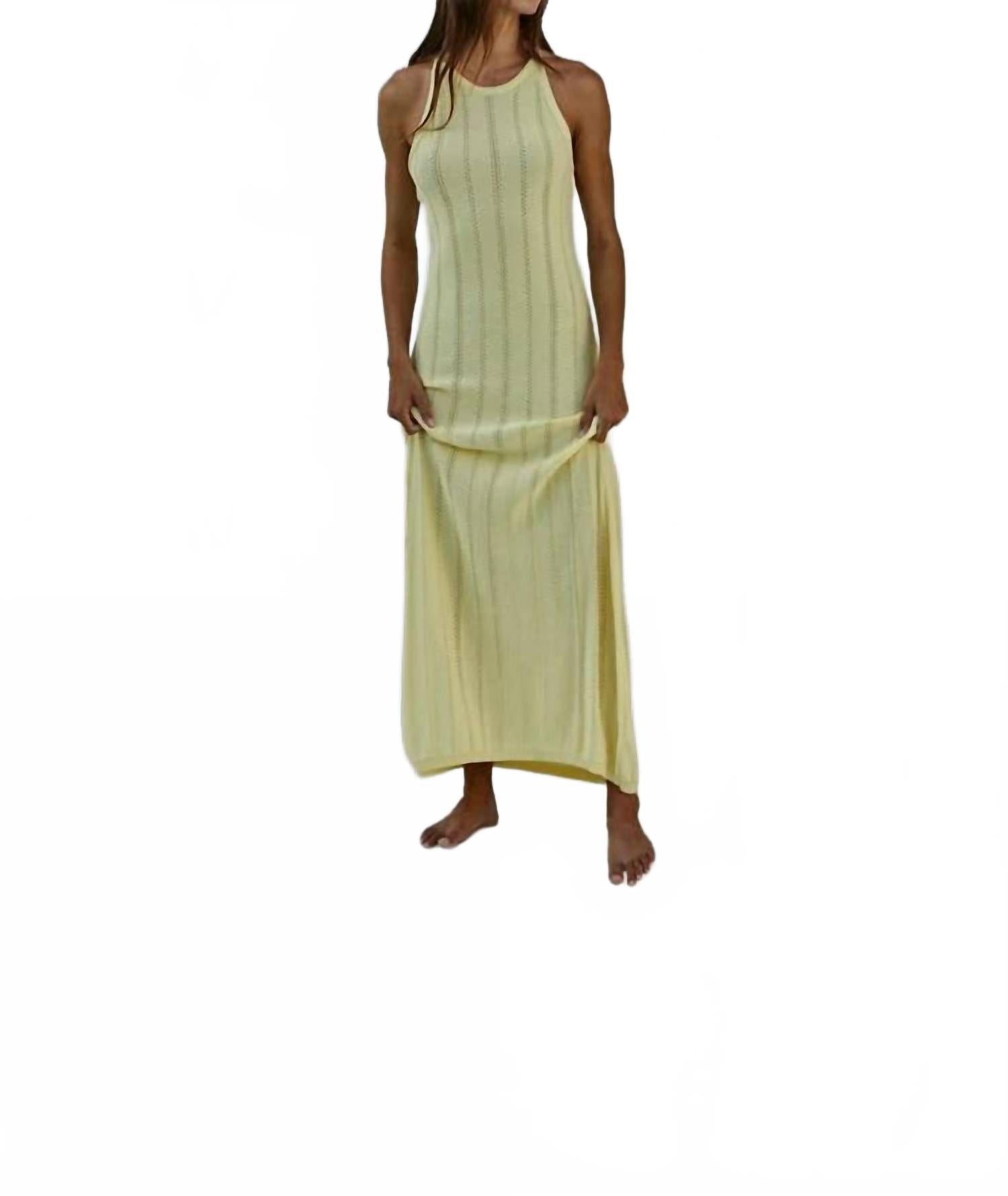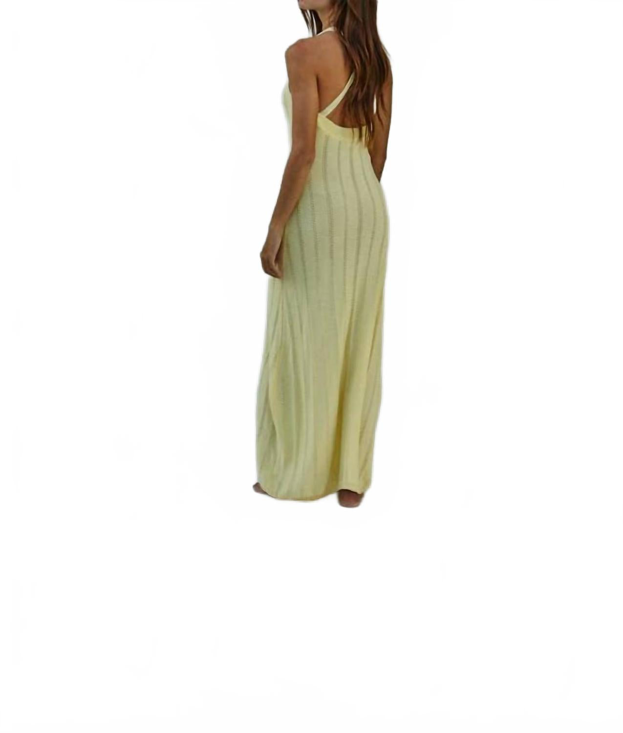 Великолепное изделие, идеально подходящее для пляжного дня. Платье-футляр без рукавов. Изготовлено из 87% вискозы и 13% нейлона. Длина миди, мягкий трикотаж с полупрозрачной отделкой светло-желтого цвета. Застежка-халтер с перекрещивающимися бретелями сзади и глубокий вырез на спине, подчеркнутый ажурными полосками и ребристой отделкой. Застежка удобная, легко надевается. Уход простой: ручная стирка.