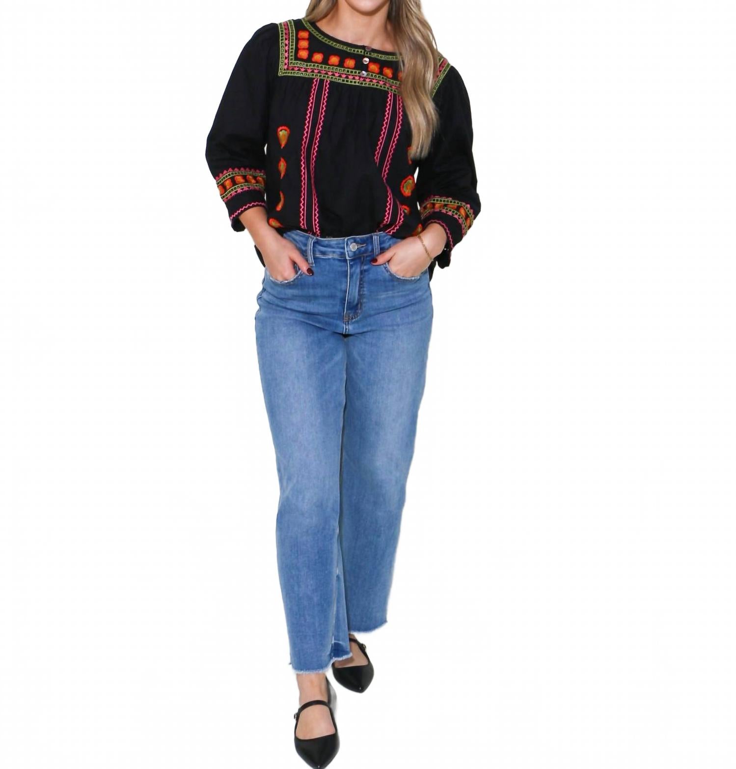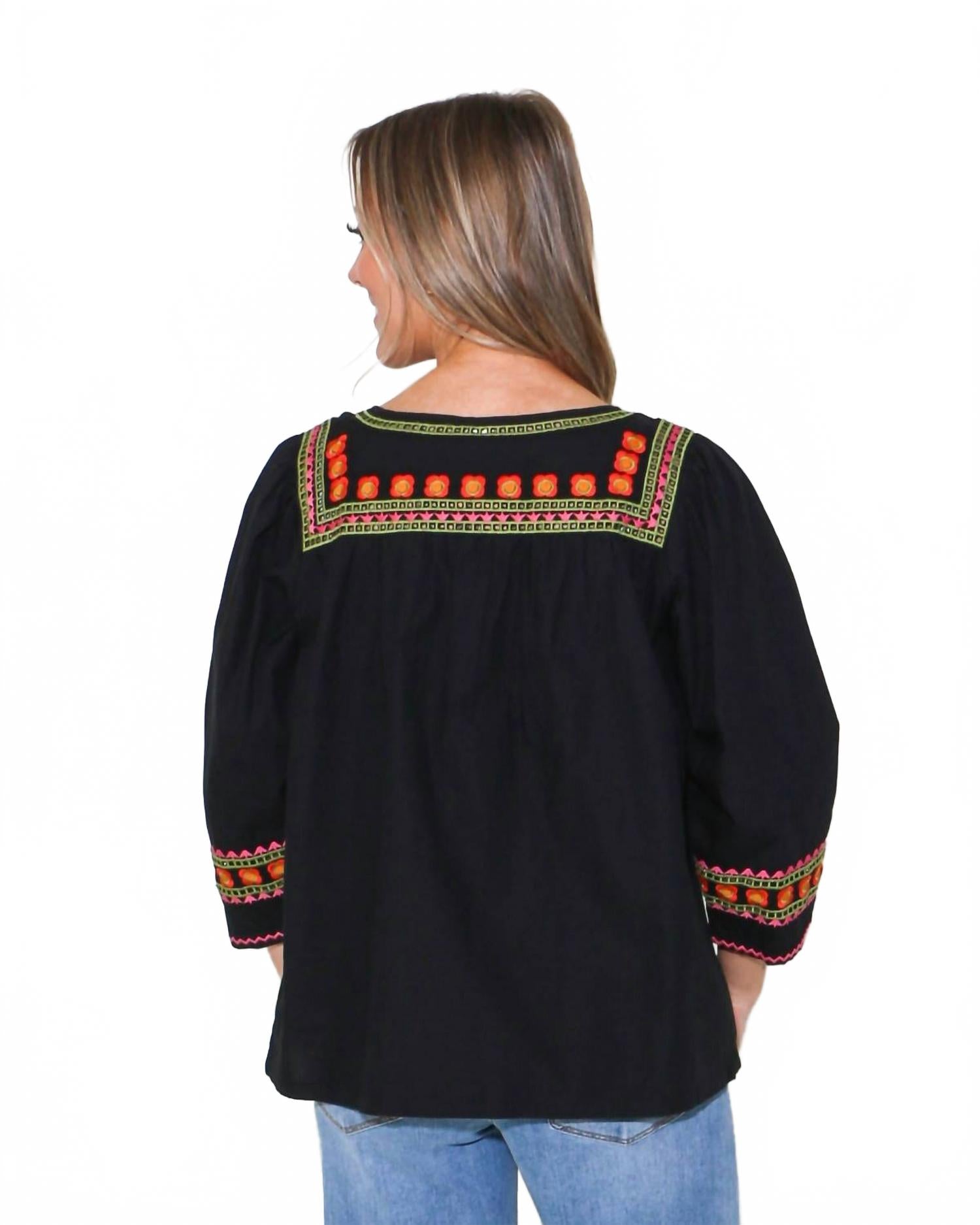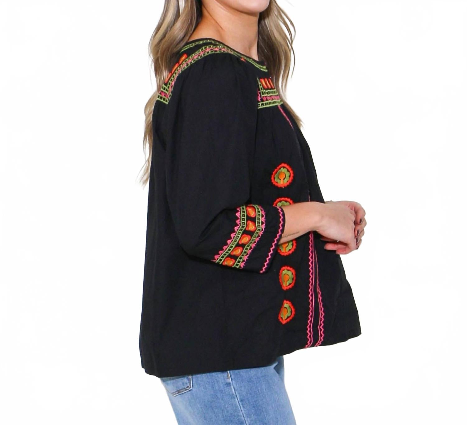 Представляем топ Ivy Jane Petals and Pearls - универсальную и модную вещь, идеально подходящую для лета. Эта женская блузка с длинными рукавами и ярким вышитым узором на гладкой черной хлопковой основе идеально подходит для работы или походов в церковь. Благодаря классическому круглому вырезу и удобной застежке на пуговицы этот топ гармонично сочетает в себе стиль и практичность.