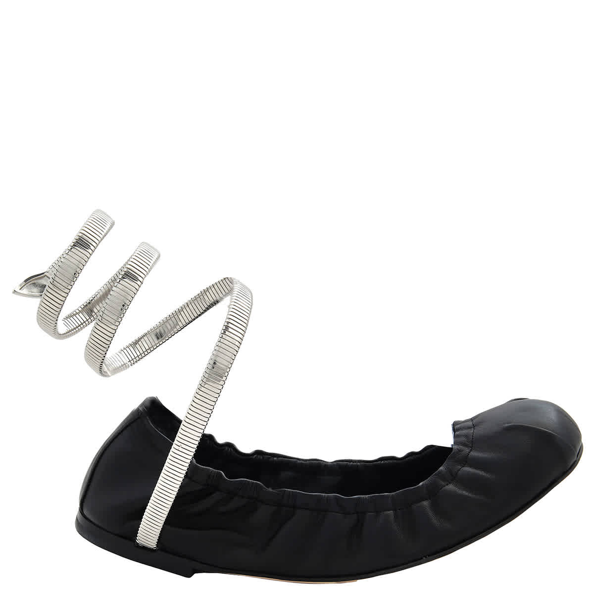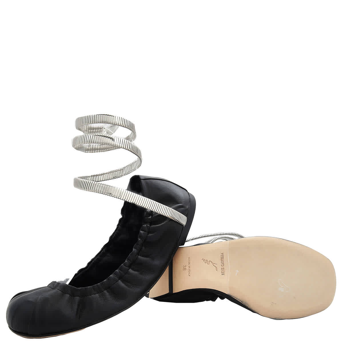 Женские балетки Rene Caovilla. Цвет: черный ягненок/серебристый металлический змеек. Балетки Rene Caovilla Juniper. Балетки Juniper, изготовленные из кожи и украшенные латунной металлической сеткой, предлагают современный стиль, сочетающий изысканность и функциональность. Круглый носок и каблук 1,2 см (0,4 дюйма). 100% кожа. Сделано в Италии.
