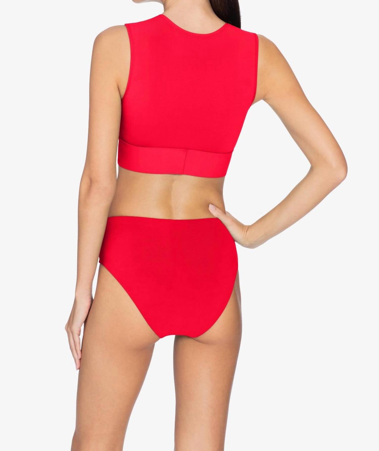 Этот топ-топ с завязкой спереди, съемными чашечками и средней степенью защиты. Изготовлен из мягкой смеси 94% микронейлона и 6% спандекса для комфортной посадки. Стирать вручную, сушить в разложенном виде на горизонтальной поверхности.