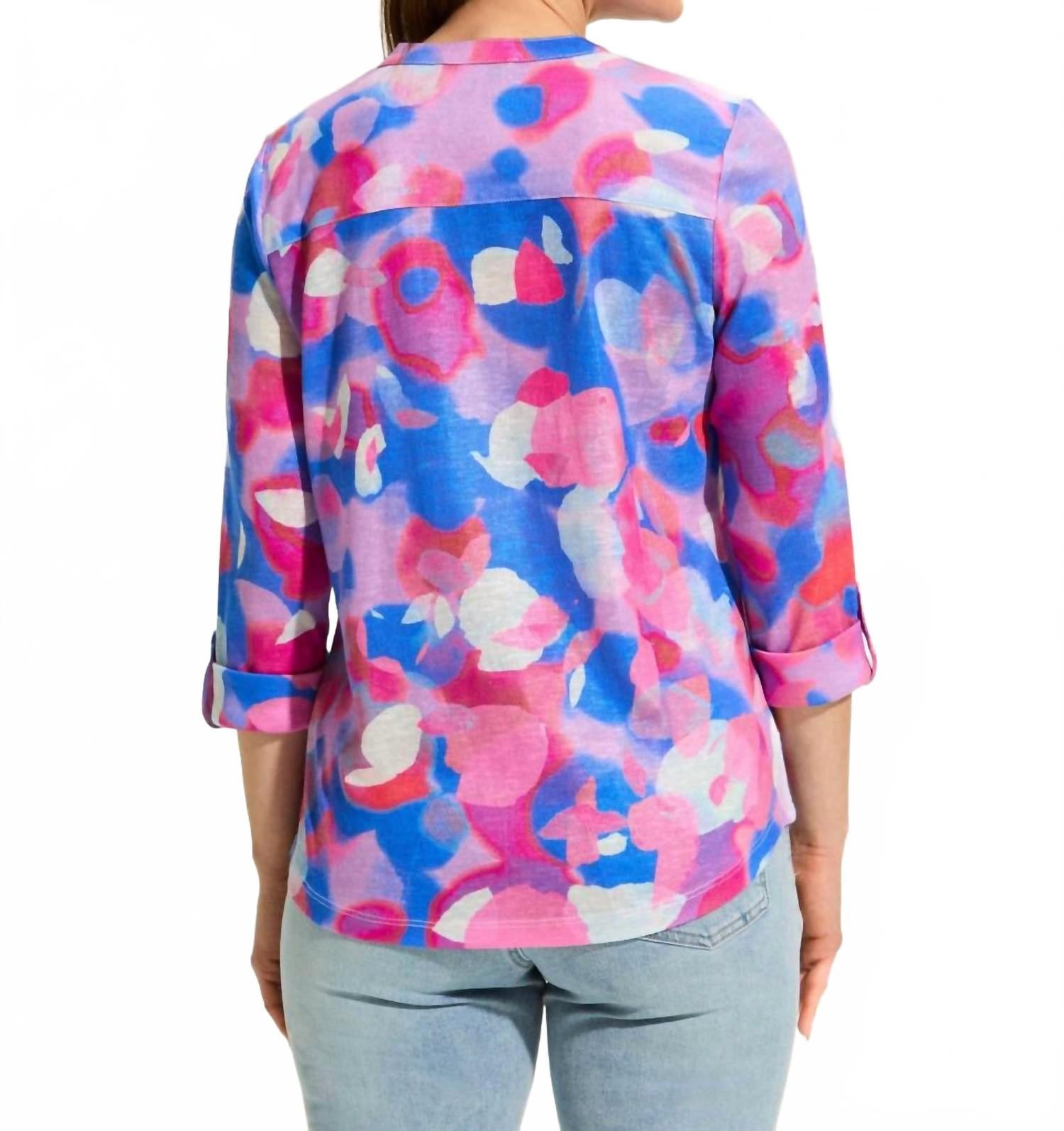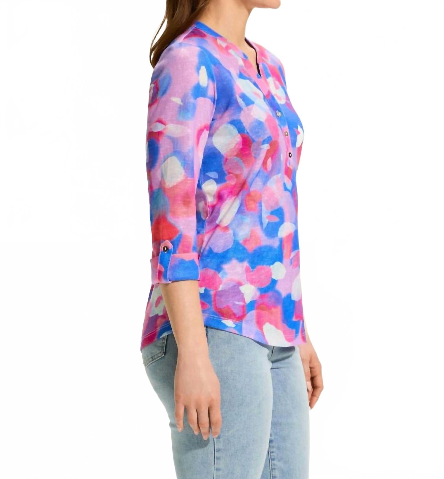 Универсальная блузка, которая подойдет и для работы, и для ужина! Топ Bright Lights от FDJ - яркий и незаменимый предмет одежды для отпуска с очаровательным разноцветным узором тай-дай. Благодаря рукаву три четверти и выгодному V-образному вырезу, блузка прямого кроя отлично сидит по фигуре. Состав: полиэстер с эластичной тканью с предварительной усадкой, обеспечивающей комфорт в течение всего дня. Застежка: пуговицы. Изделие не требует особого ухода.