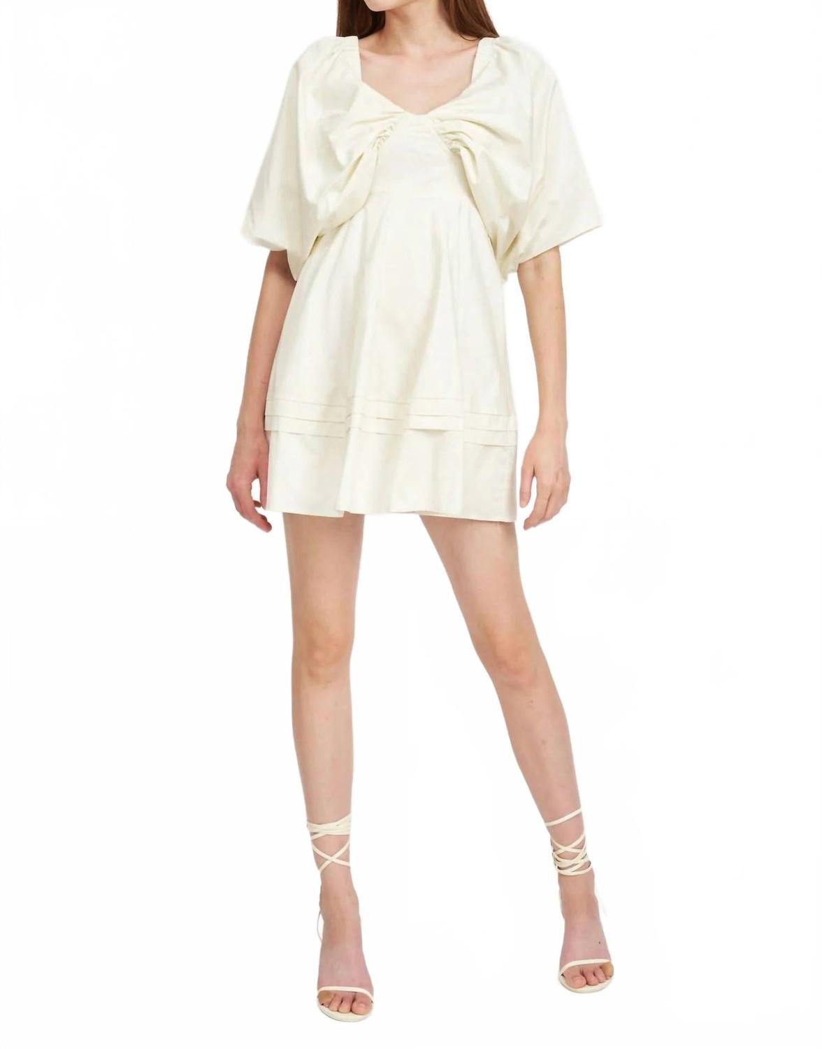 Идеальное мини-платье для теплых месяцев. Представляем мини-платье Lila от En Saison - великолепное изделие из 100% хлопкового поплина элегантного кремового оттенка. Это мини-платье с короткими широкими рукавами-бабочками и классическим вырезом сердечком, подчеркнутым плиссировкой по подолу и потайными косточками на груди. Потайная молния сзади обеспечивает идеальную посадку. Инструкция по уходу: только ручная стирка. Рост модели - 175 см, размер S.