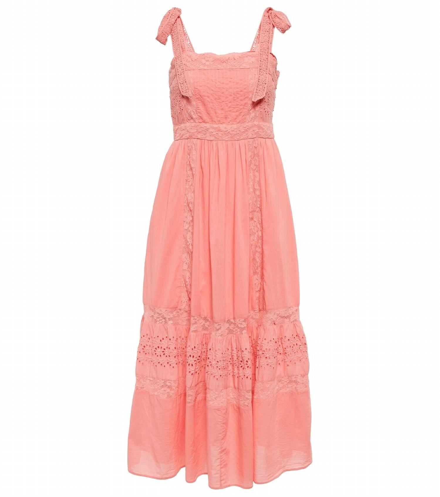 Погрузитесь в атмосферу бохо-шика на ваших весенних званых ужинах. Платье миди А-силуэта без рукавов в ярком цвете «розовый миллениал». Изготовлено из 100% воздушного хлопкового поплина. Отделка кружевом и вышивкой. Сделано в Индии. Изящный квадратный вырез, присборенная талия и практичная застежка-молния. Уход за этим узорчатым платьем: машинная стирка при 30 градусах.