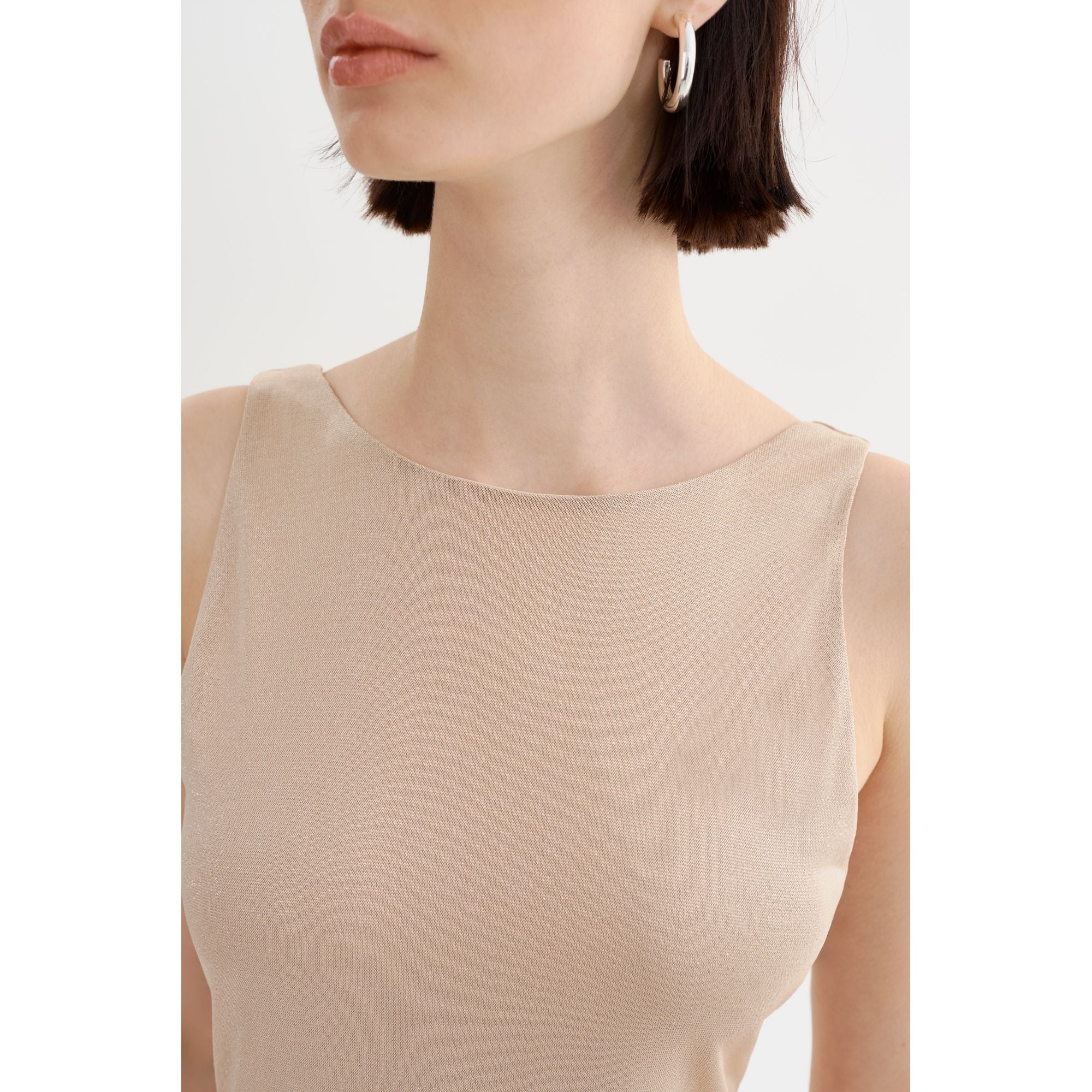 Платье макси без рукавов KYRYLA сочетает в себе непринужденную элегантность и смелый дизайн. Это приталенное платье макси из трикотажного полотна с металлизированным эффектом имеет элегантный круглый вырез и эффектный глубокий U-образный вырез на спине с перекрученной деталью. Аккуратный вырез горловины и пройма рукава придают ему изысканный вид. С каблуками или минималистичными аксессуарами это платье станет идеальным выбором для особых случаев.