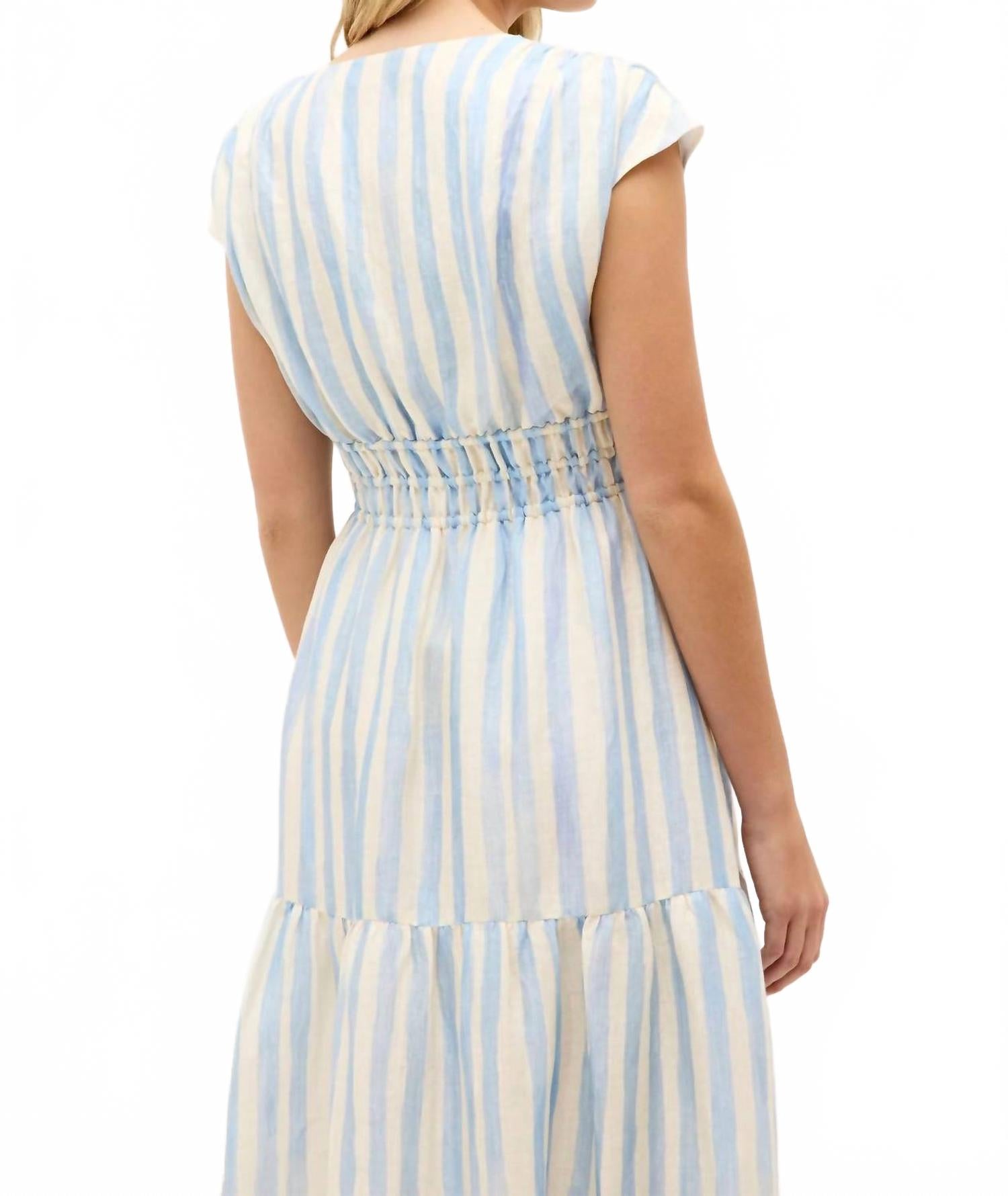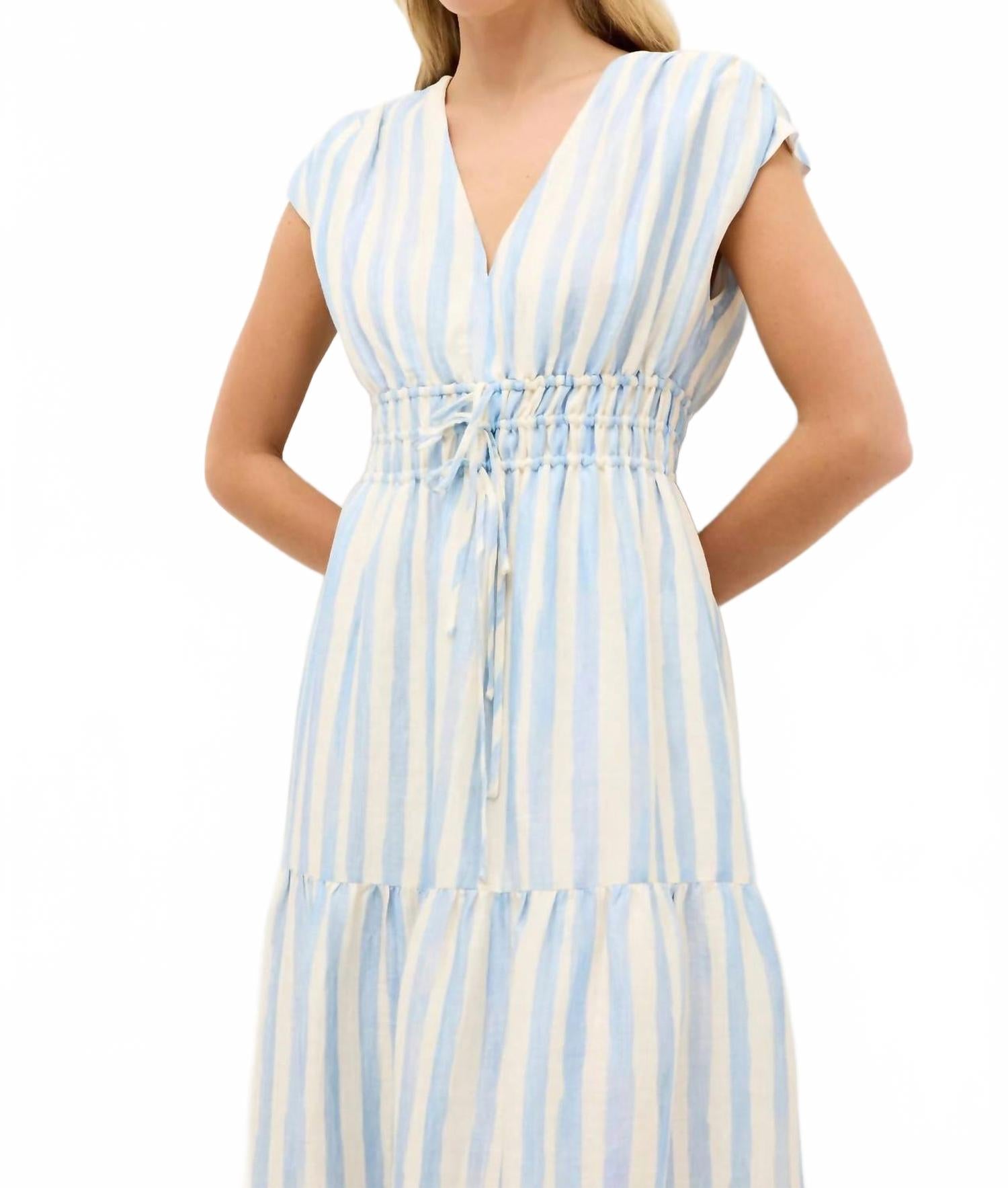 Представляем платье миди Indy от Marie Oliver - очаровательный летний аксессуар в полоску цвета агуа с акварелью. Платье имеет изящные рукава-крылышки, свободный силуэт и эластичный пояс с кулиской, идеально дополняющий слегка расклешенную юбку миди. Состав: 60% вискоза, 20% лен, 20% нейлон. Застежка: надевается. Уход: ручная стирка с щадящим моющим средством и сушка на веревке или химчистка.