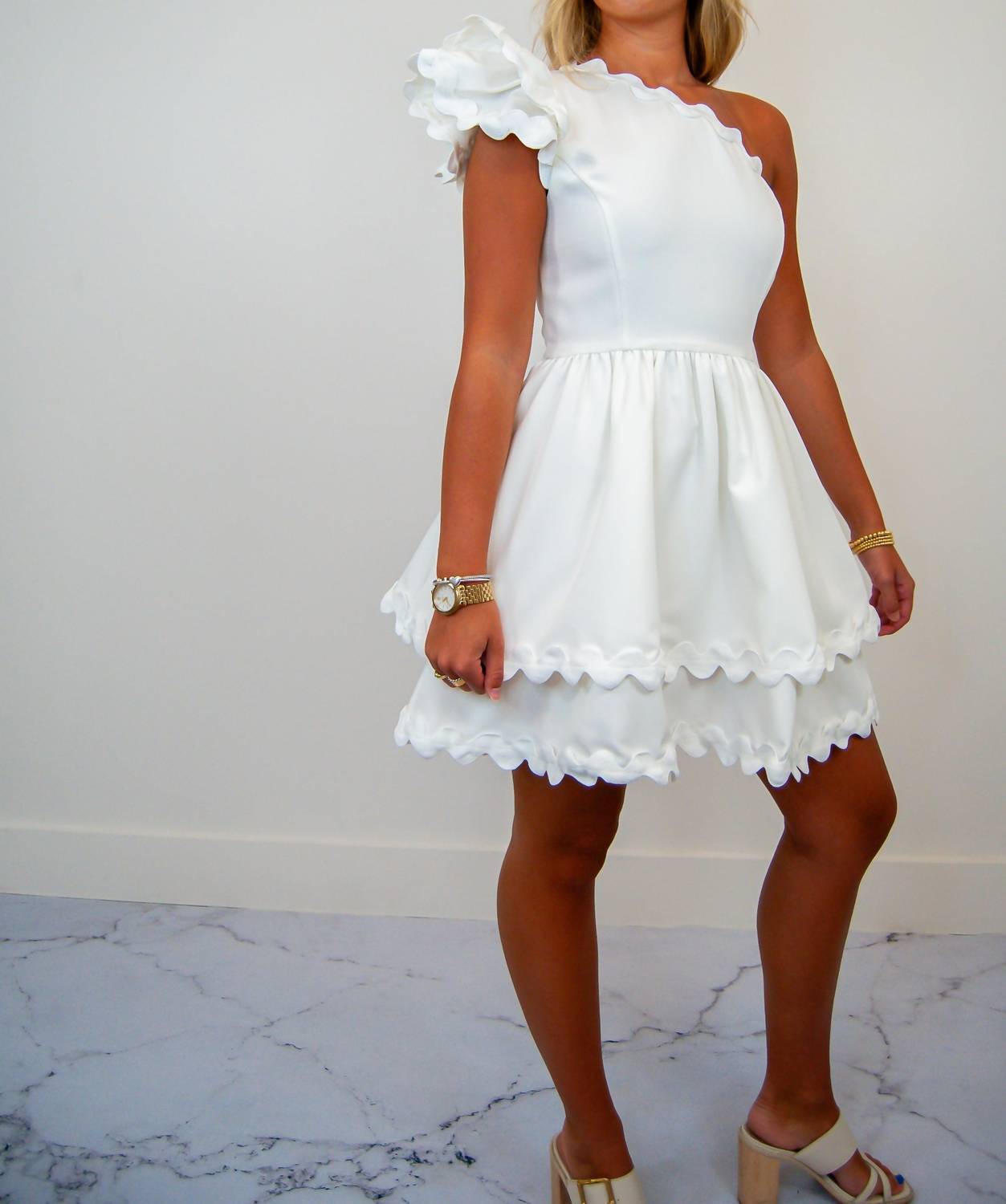 Идеально скроено и идеально сидит. Откройте для себя мини-платье на одно плечо с фестончатым краем от Main Strip - шикарный выбор для любого случая. Это белое платье без рукавов с игривым фестончатым краем и соответствующей отделкой из бисера дополняется приталенным лифом и А-силуэтом, подчеркивающим фигуру. Это платье с однотонным узором, изготовленное из 95% полиэстера и 5% спандекса, сочетает в себе стиль и комфорт. Застежка - надевается.