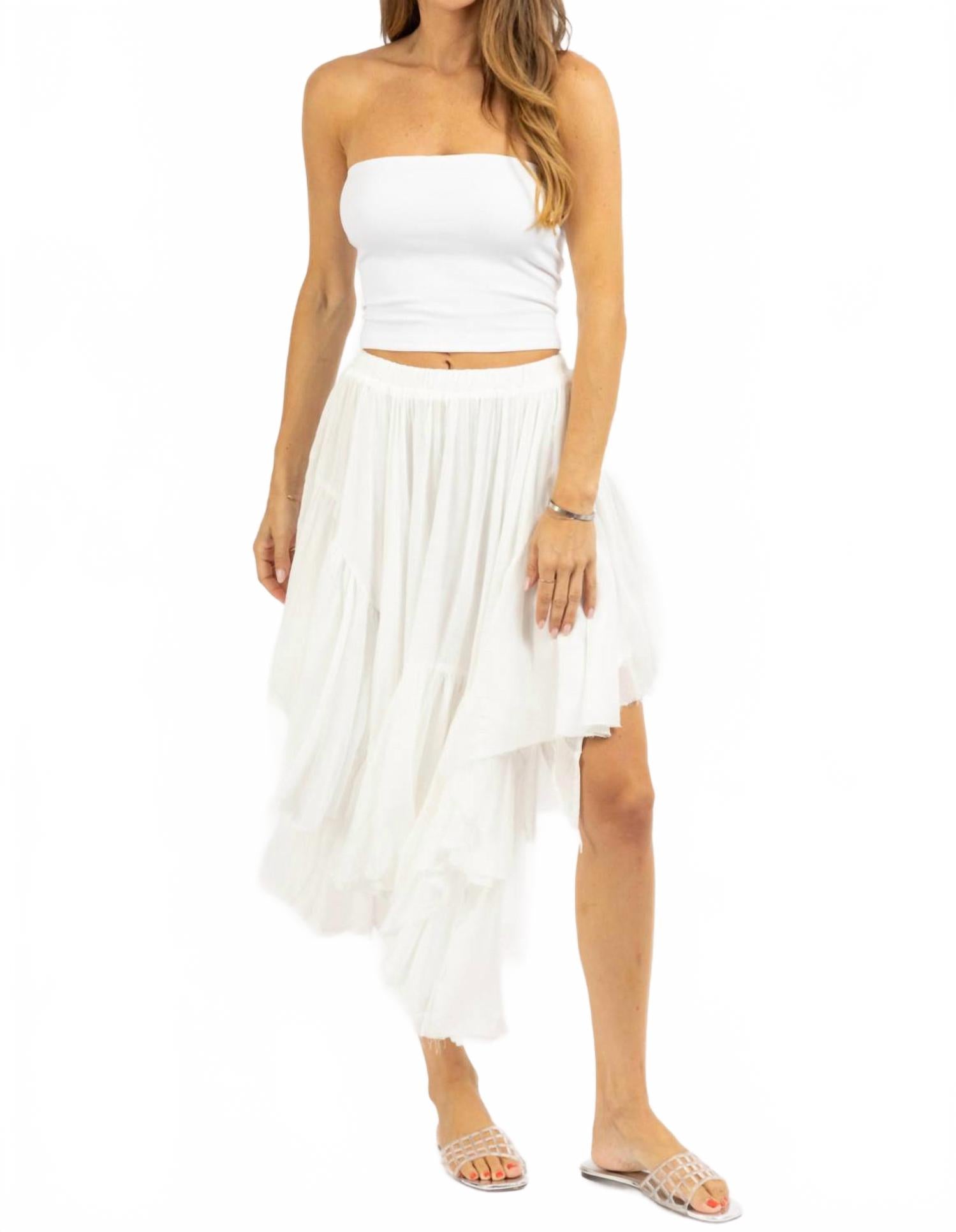 Заправьте любимую футболку, чтобы создать более непринужденный и женственный образ. Представляем юбку-макси Santa Maria от Et Clet - минималистичный базовый предмет гардероба, идеально подходящий для весны и Дня независимости. Юбка выполнена из 100% хлопка однотонного белого цвета, имеет свободный крой, эластичный пояс и асимметричный подол. Застежка - надевать. Уход - машинная стирка. На модели Наоми размер S (рост 178 см, размер платья 2).