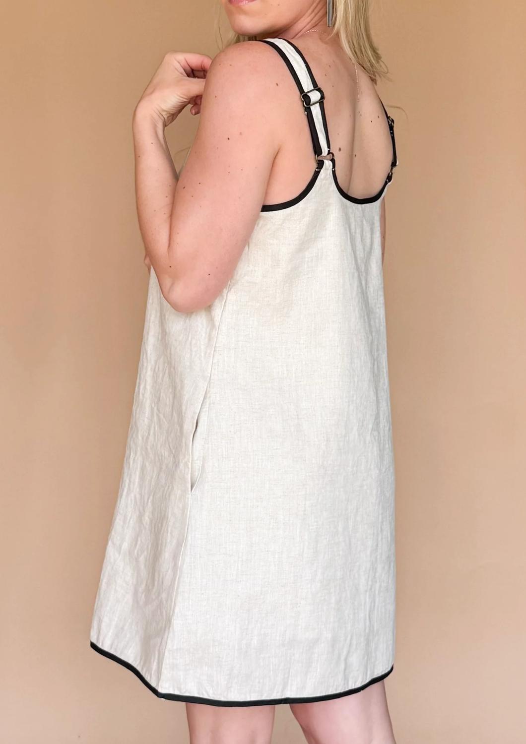 Идеальное мини-платье для теплых месяцев. Представляем платье Piper от MIOU MUSE - стильное дополнение к вашему гардеробу, сочетающее элегантность и непринужденность. Это мини-платье без рукавов с широкими регулируемыми бретелями и квадратным вырезом придает ему изысканность. Однотонный овсяный цвет с гладкой черной окантовкой и функциональными карманами делает его универсальным выбором для любого образа в отпуске. Застежка: боковая молния.