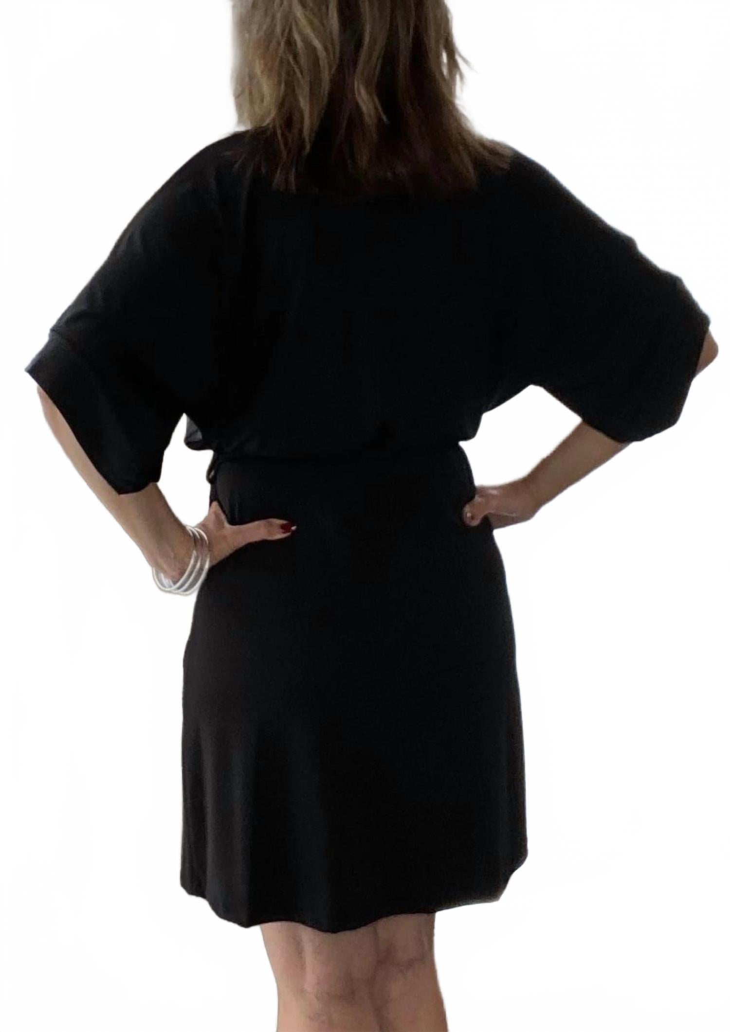 Короткое и воздушное платье для теплых дней. Насладитесь сдержанной элегантностью в платье-кимоно Ariella с V-образным вырезом в классическом черном цвете. Это платье-халат с рукавами три четверти и эффектным поясом создает ощущение сдержанной роскоши. Это мини-платье изготовлено из 94% полиэстера и 6% спандекса и произведено в США. Рекомендации по уходу: ручная стирка в холодной воде и сушка на веревке для сохранения идеального состояния.