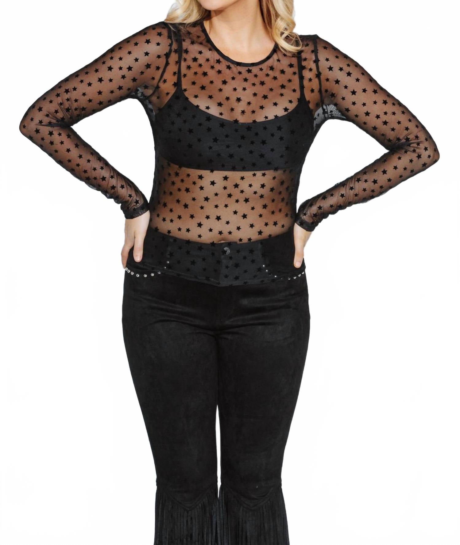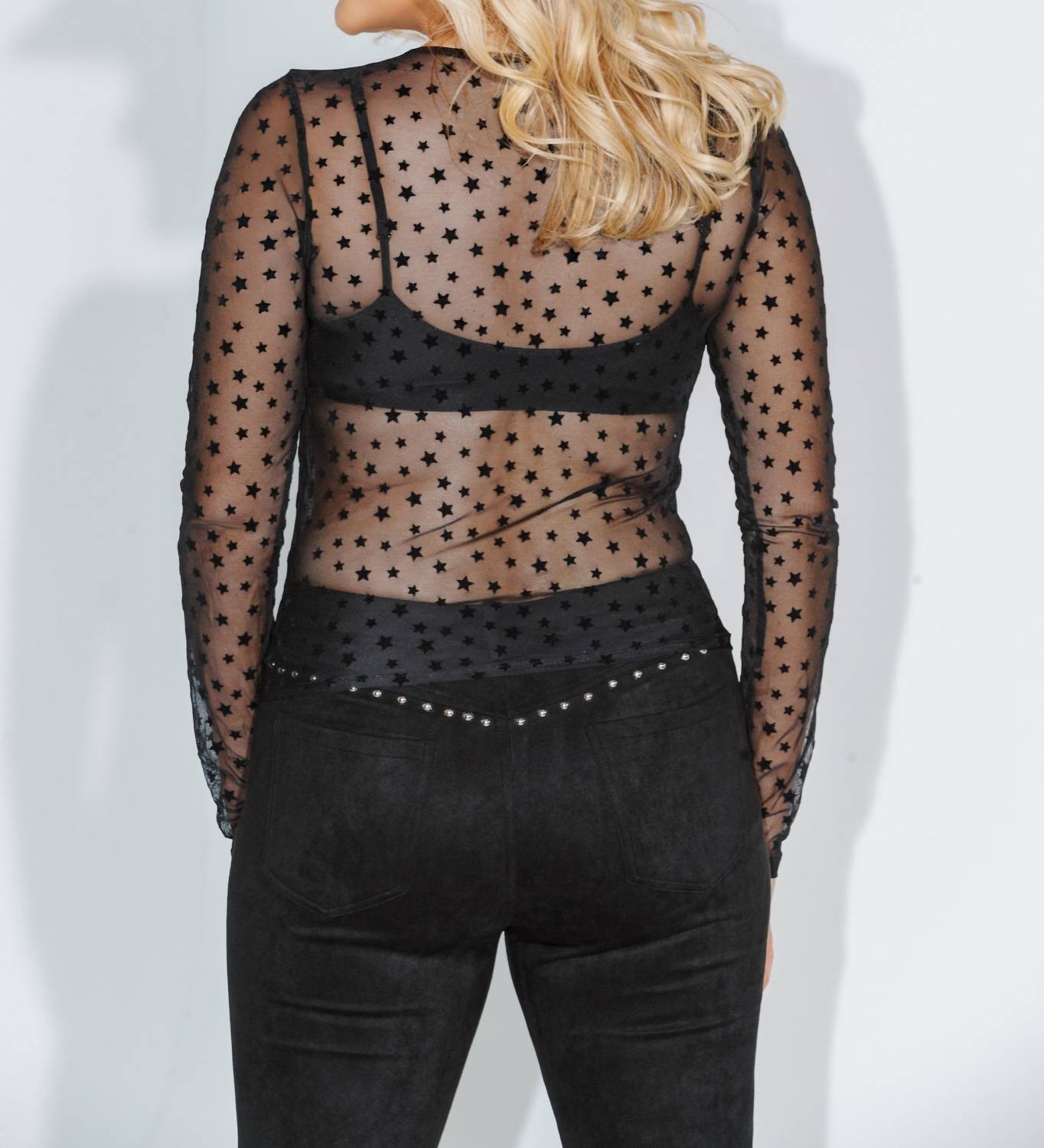 Добавьте изысканности в свой гардероб, выбрав стильную и универсальную вещь для модницы, которая ходит на концерты. Топ с длинными рукавами облегающего кроя и умеренной эластичностью. Изготовлен из 100% нейлона, что обеспечивает прозрачность, подчеркивающую изысканный звездный узор. Застежка-липучка. Ручная стирка в холодной воде, сушка в разложенном виде.