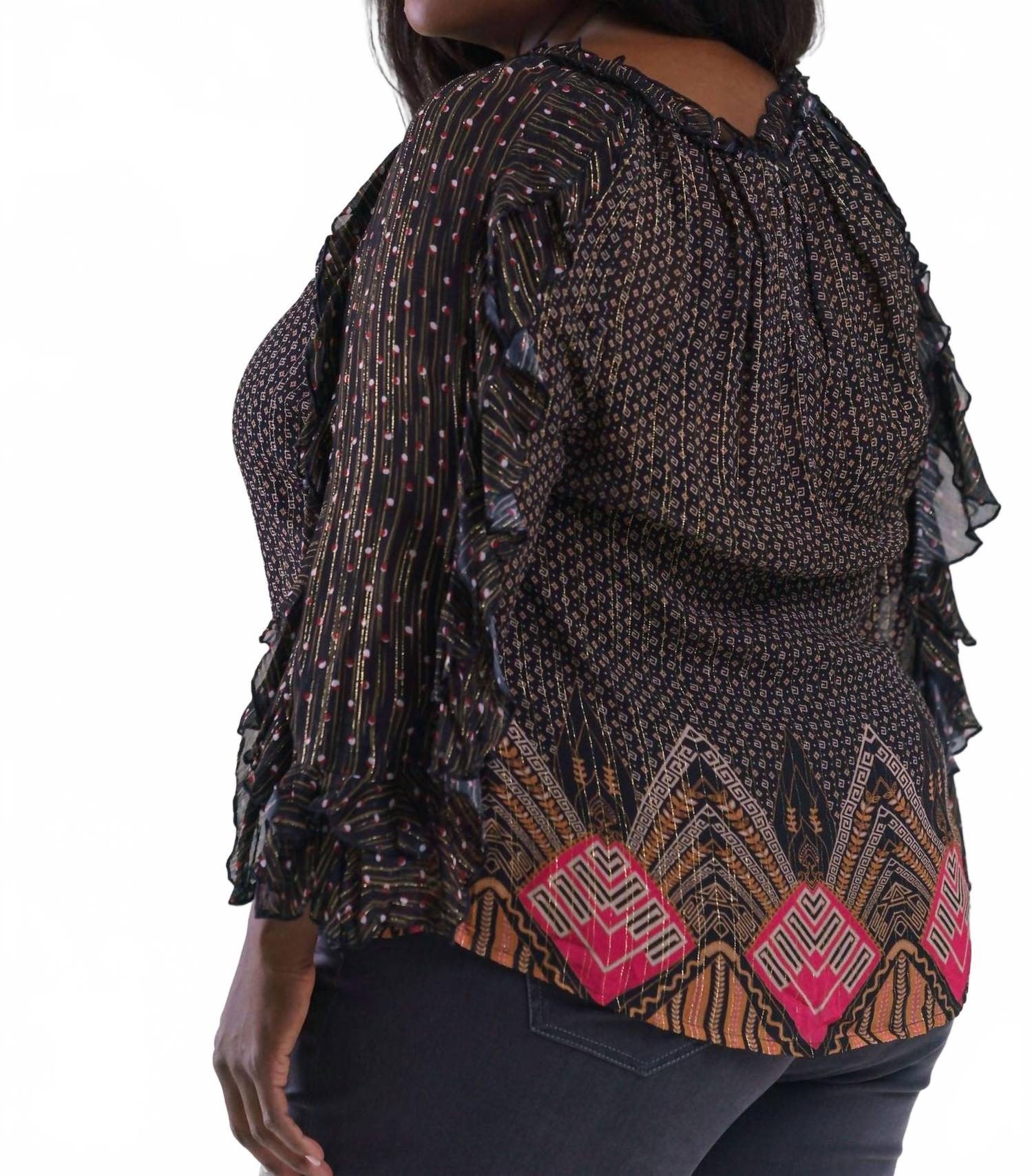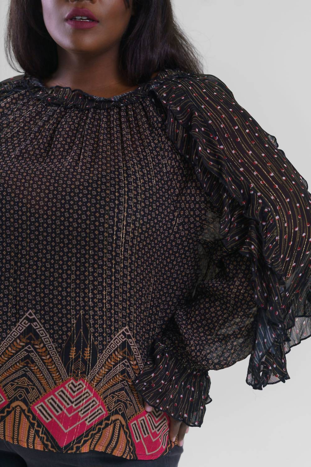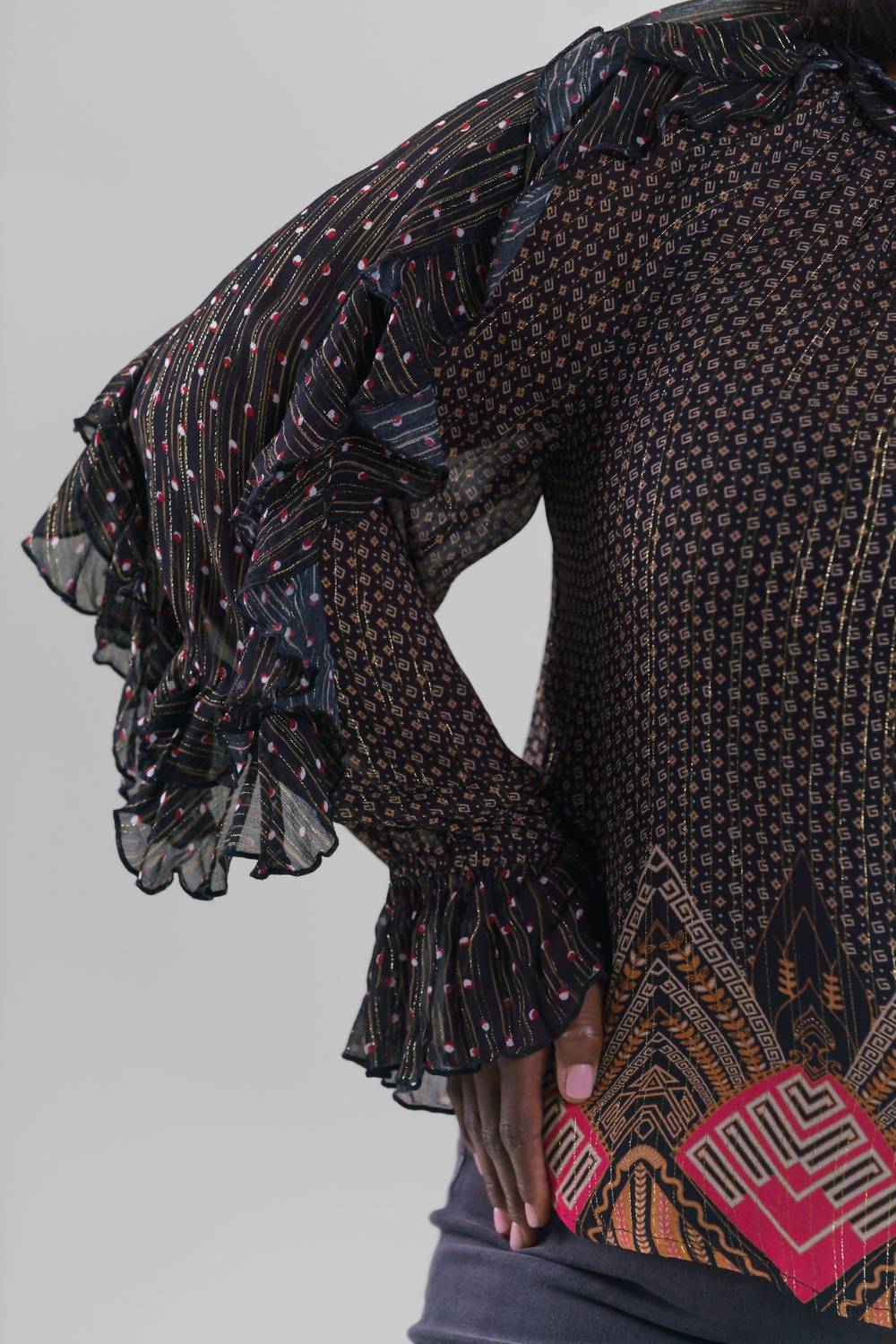 Блузка, которая никогда не выйдет из моды, вне времени. Представляем топ Kelina от bl^nk - эффектное дополнение к вашему праздничному гардеробу. Эта черная блузка с рукавами три четверти, украшенными оборками, подчеркивает ее женственность. Изготовленная из полиэстера, она украшена мелким черно-красным геометрическим узором и контрастным узором по низу. Благодаря застежке-липучке, ее легко носить. Уход: ручная стирка и сушка на веревке.