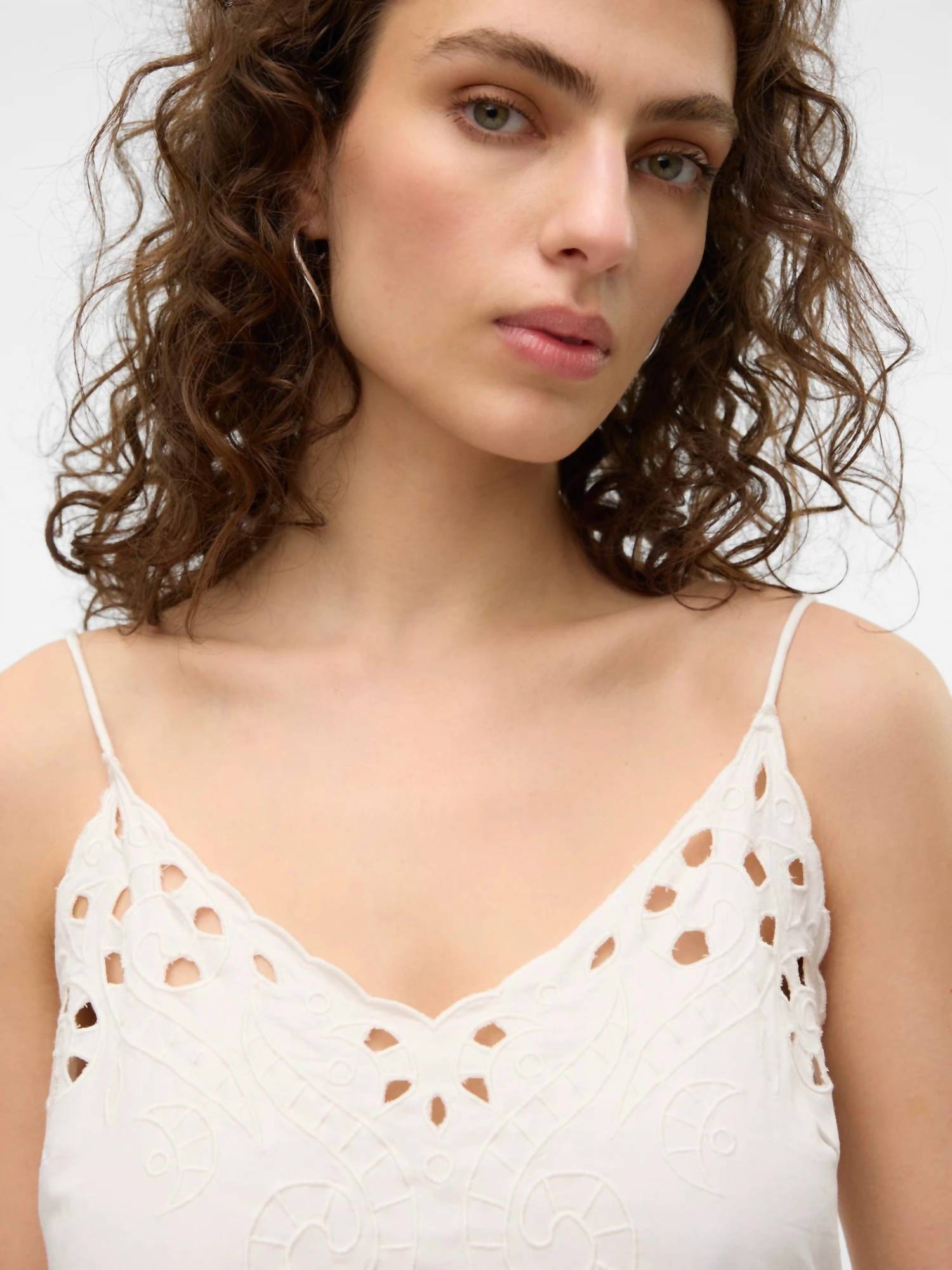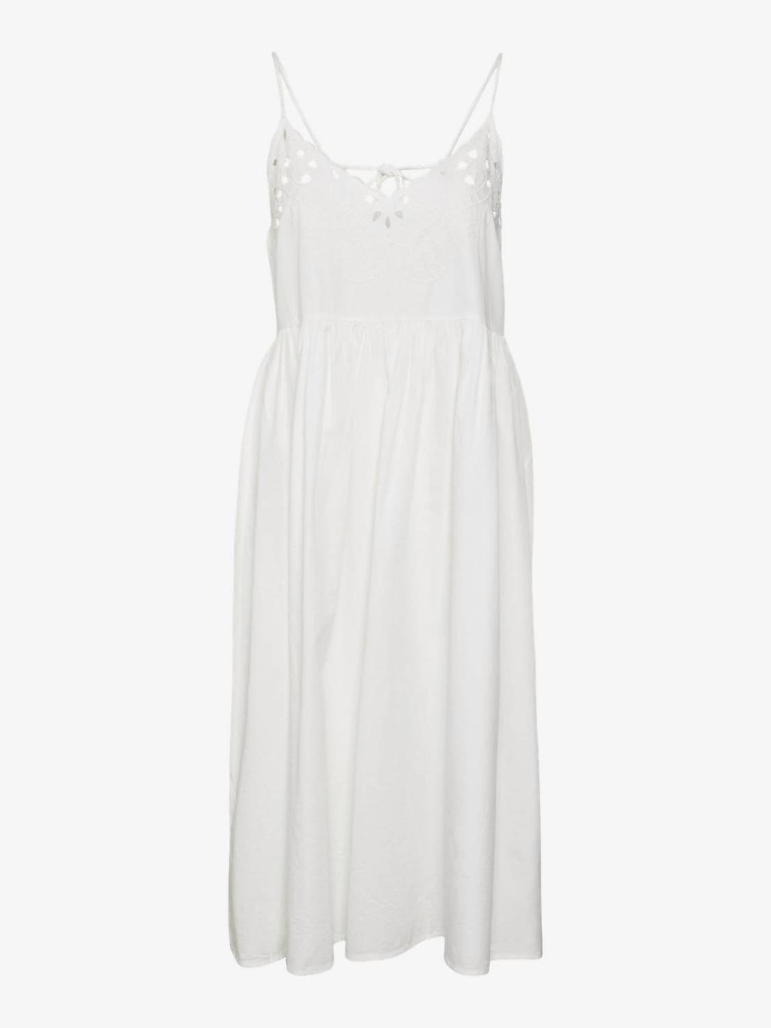 Платье идеальной длины существует. Откройте для себя платье Vero Moda Vera - воплощение тихой роскоши с его изысканно вышитыми вырезами. Это платье миди из хлопковой смеси с тонкими бретельками и V-образным вырезом дополнено регулируемыми завязками и элегантной открытой спиной. Состав: 63% хлопок, 37% вискоза. Застежка: завязка. Это платье, сделанное в Индии, идеально подходит для весенних свадеб и легко стирается в стиральной машине.