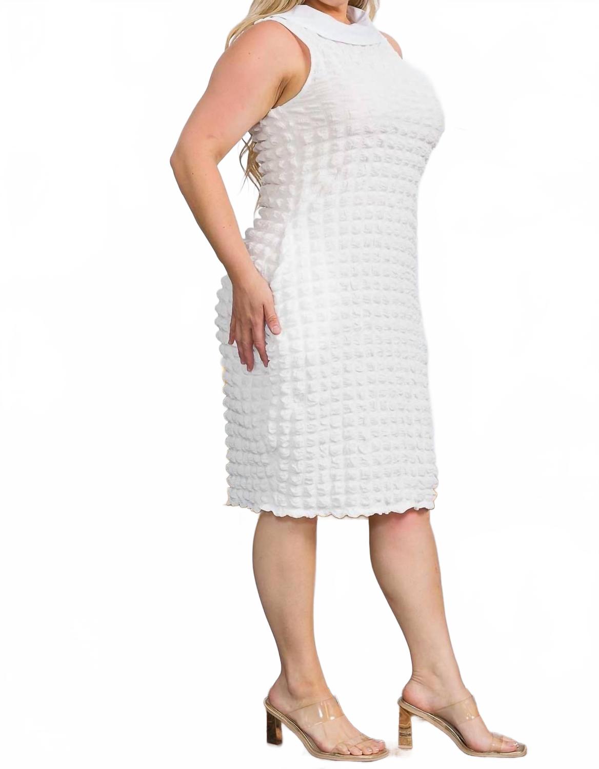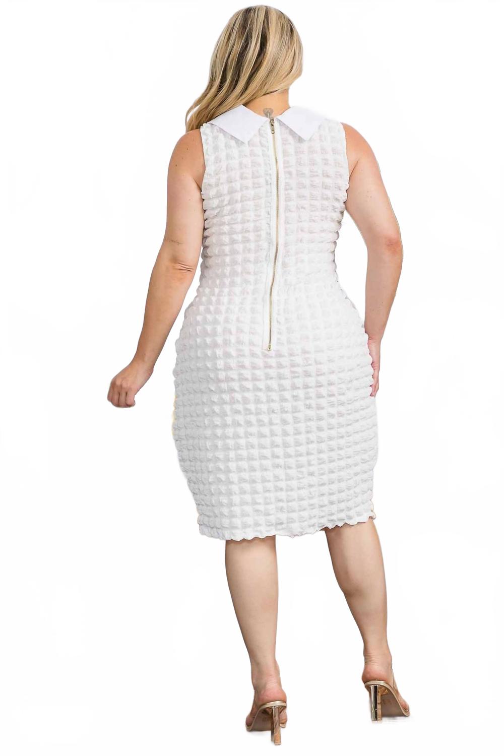 Представляем облегающее платье Collared Popcorn от Karen T Design - фактурное белое платье, идеально подходящее для минималистичного летнего стиля. Это платье миди без рукавов имеет облегающий силуэт, модный вырез горловины и удобную застежку-молнию сзади. Благодаря дополнительным карманам оно сочетает в себе стиль и функциональность. Универсальное и идеально подходит для отпуска.
