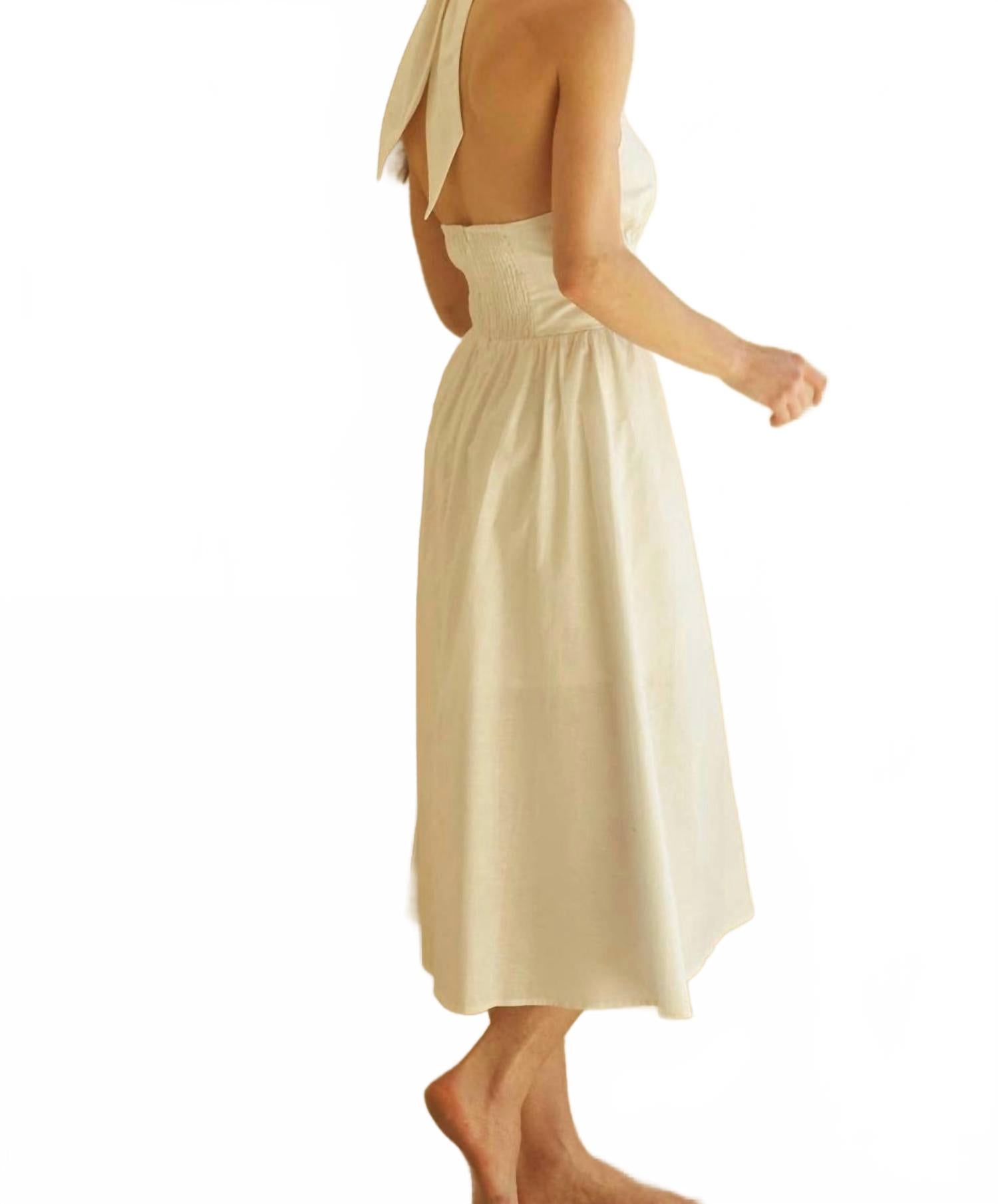 Просто добавьте шлепанцы или мюли, и все готово. Платье-миди Kate Halter от CRESCENT - элегантный выбор для любого званого ужина или весеннего торжества. Это платье без рукавов с присборенным лифом и А-силуэтом, облегающим и расклешенным, подчеркивает женственность фигуры. Платье изготовлено из смеси хлопка (55% хлопка и 45% льна), крой без застежек обеспечивает легкость и комфорт. Уход: машинная стирка. Рост модели 175 см, размер S.