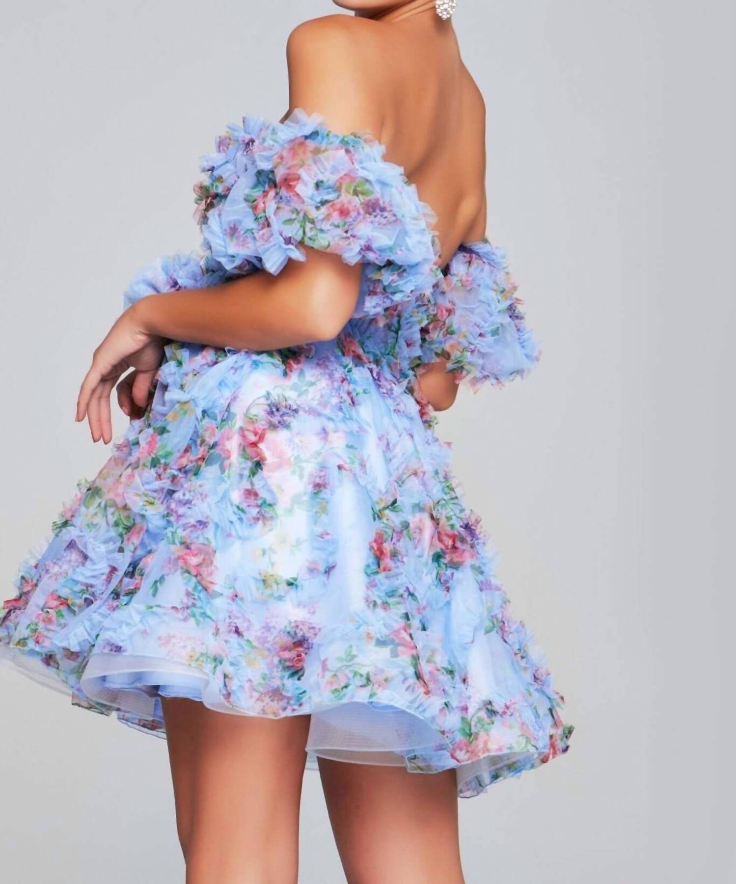 Встречайте мини-платье без бретелек Fit And Flare от Jovani - воплощение элегантности, идеально подходящее для коктейльных вечеринок или свадебного наряда. Это короткое платье без бретелек с вырезом в форме сердечка выполнено из атласа с цветочным узором и имеет облегающий, расклешенный силуэт. Его привлекательность с открытыми плечами подчеркивают съемные рукава, украшенные розетками.