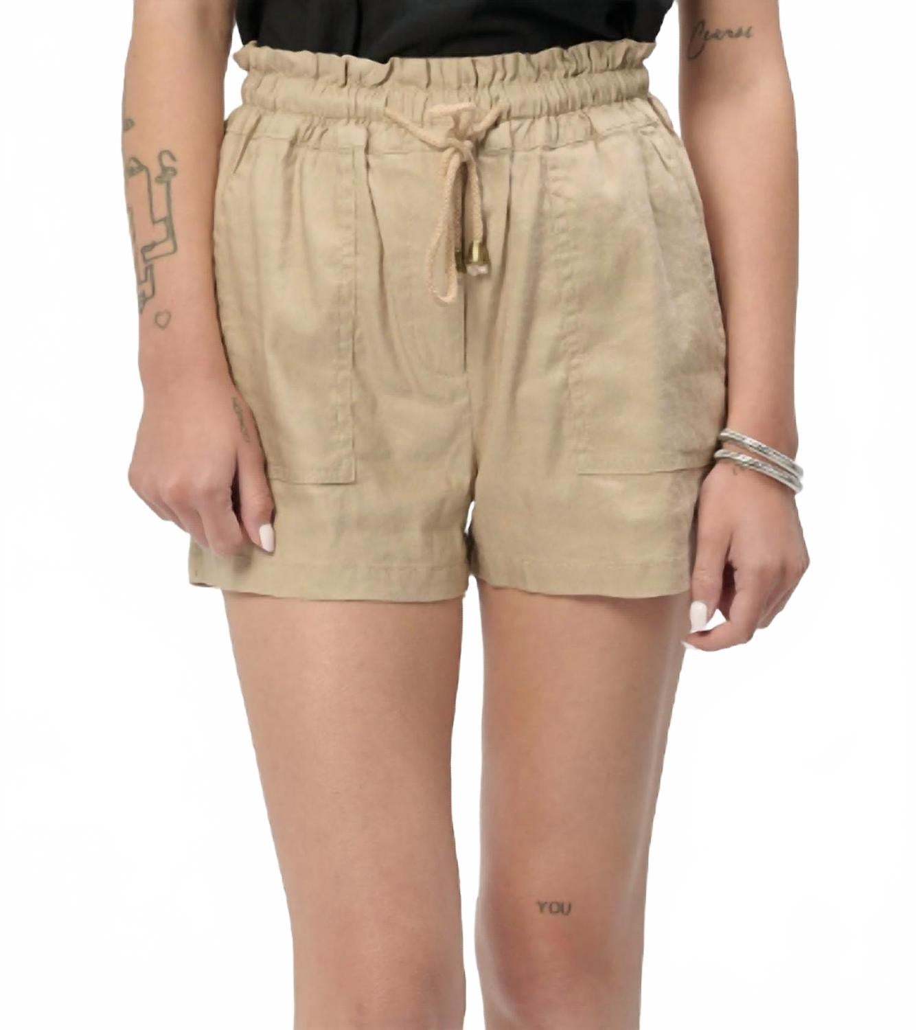 Высокая талия в моде, и мы особенно любим этот фасон. Откройте для себя шорты Audra от Another Love - идеальный спутник для игривого и беззаботного лета. Эти шорты бежевого цвета с высокой талией, изготовленные из комфортной смеси льна, вискозы и спандекса, отличаются уникальным шнурком и однотонным узором. Застежка: надевайте. Уход: машинная стирка. Благодаря карманам для дополнительного удобства они идеально подходят для отпуска.