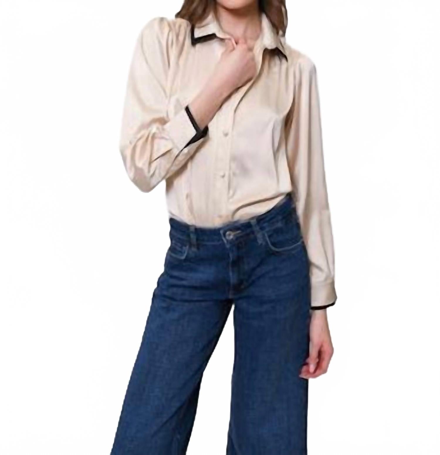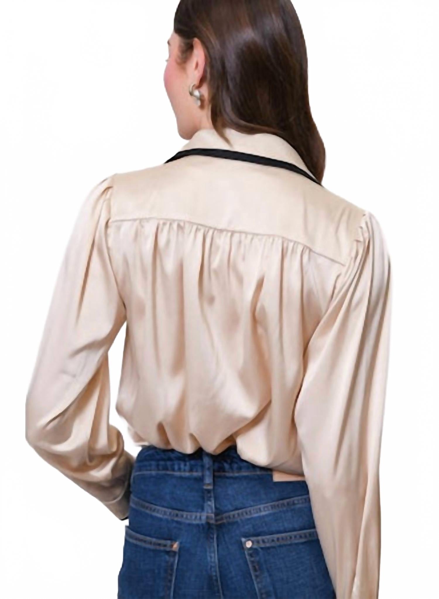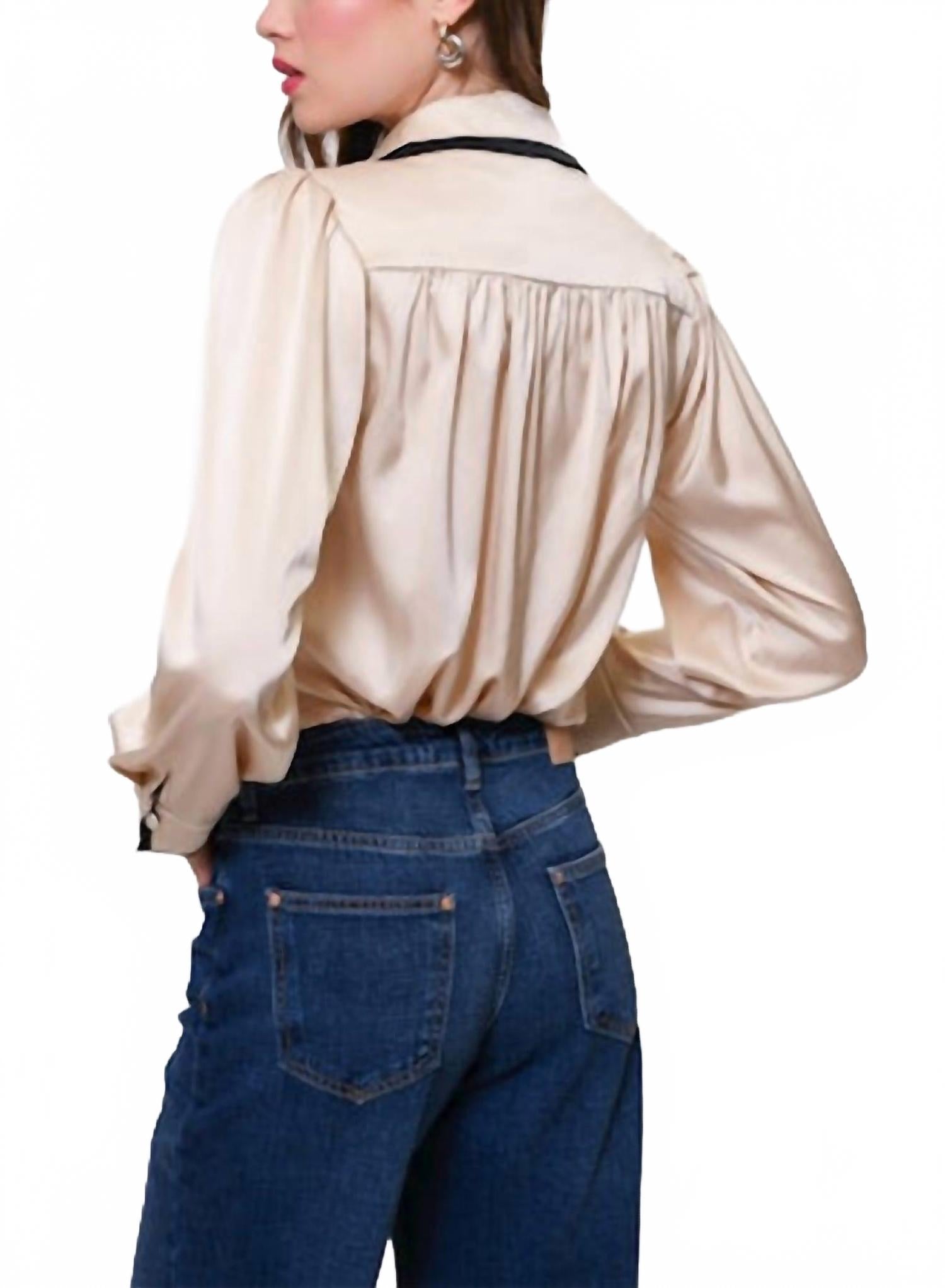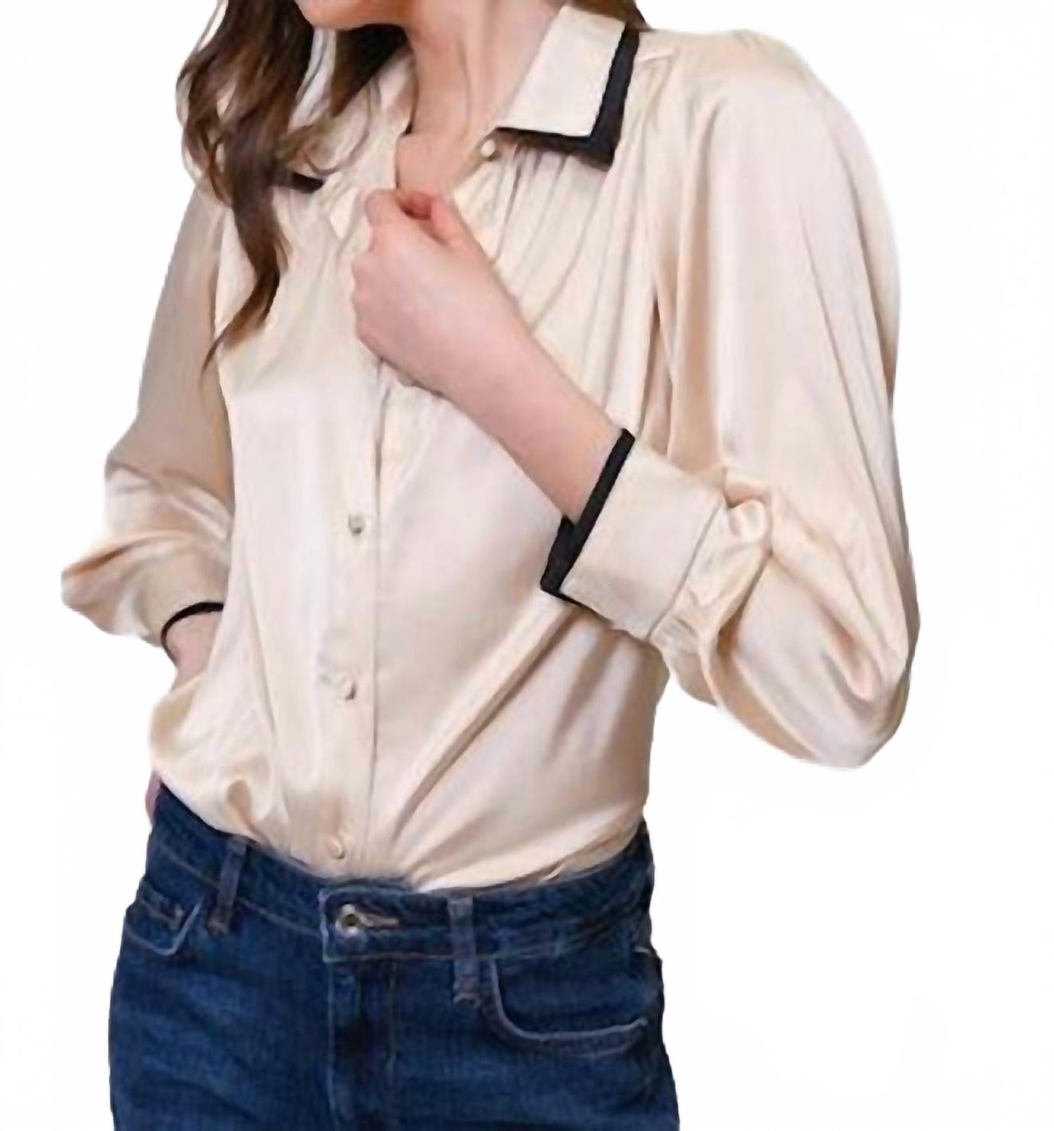 Изысканная цветовая гамма «шампань/черный» идеально дополнит ваш гардероб для путешествий этой осенью. Рубашка с длинными рукавами и застежкой на пуговицы. Изготовлена из атласа. Имеет стильную многослойную отделку и обтянутые пуговицы спереди. Длина изделия - 23 дюйма. Изящный и современный силуэт. Для сохранения роскошного внешнего вида рекомендуется химчистка.