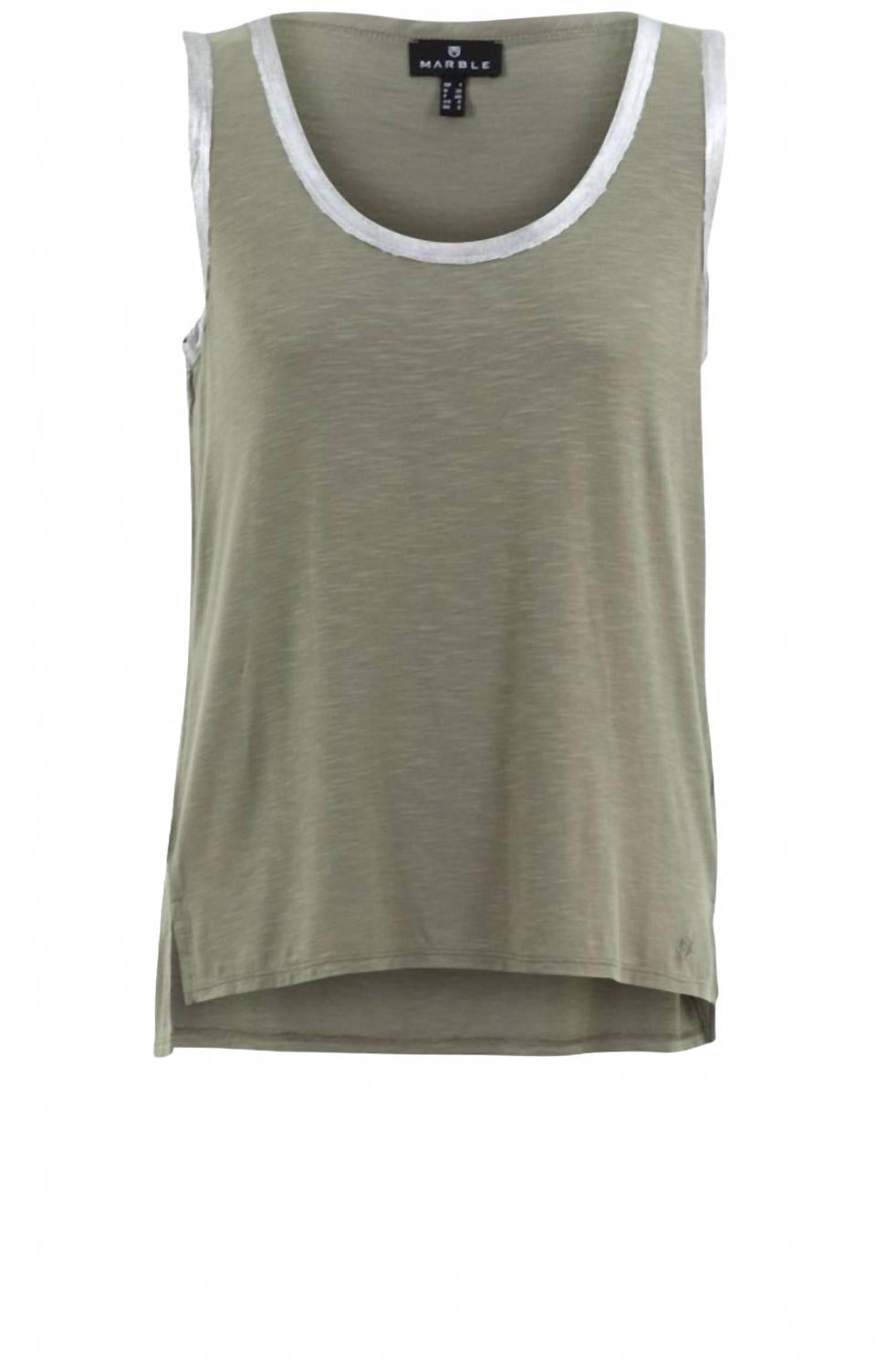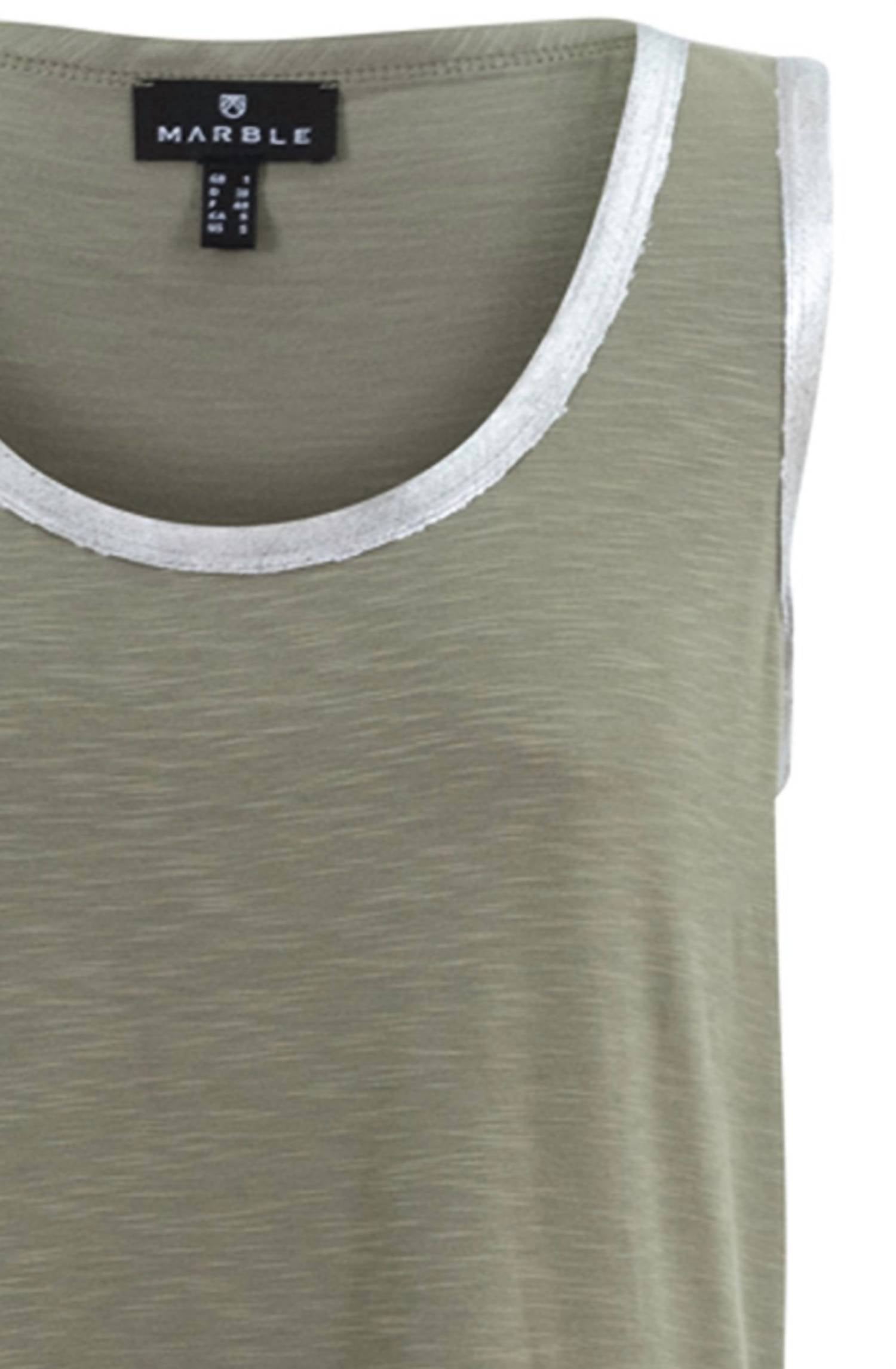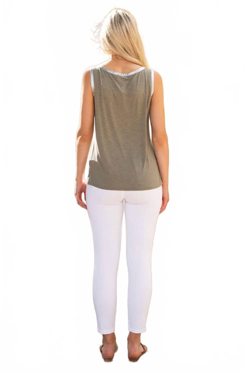 Эта безрукавка в шикарном цвете хаки украшена очаровательным серебристым мерцанием вокруг круглого выреза и рукавов, добавляя нотку гламура вашему образу. Этот топ прямого кроя из смеси 95% вискозы и 5% эластана обеспечивает комфорт благодаря легкому эластичному трикотажу. Длина изделия составляет 23,23 дюйма, а застежка - удобна. Для легкого ухода можно стирать в стиральной машине.