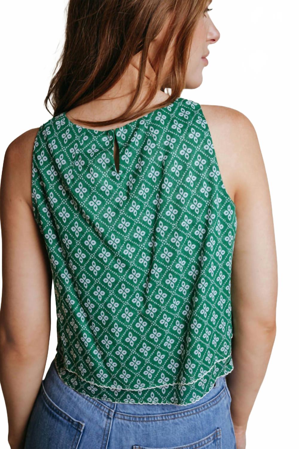 Сочетайте эту модель с любимыми джинсами и шлепанцами для следующей девичьей вечеринки. Представляем топ без рукавов June от LAROQUE - незаменимую вещь в стиле бохо-шик с ярким геометрическим принтом Verde. Эта легкая женская блузка из чистого хлопка идеально подходит для летних прогулок. Верх имеет стильный вырез-лодочку и удобную застежку-липучку для удобства ношения. Рекомендации по уходу: ручная стирка и сушка на веревке.