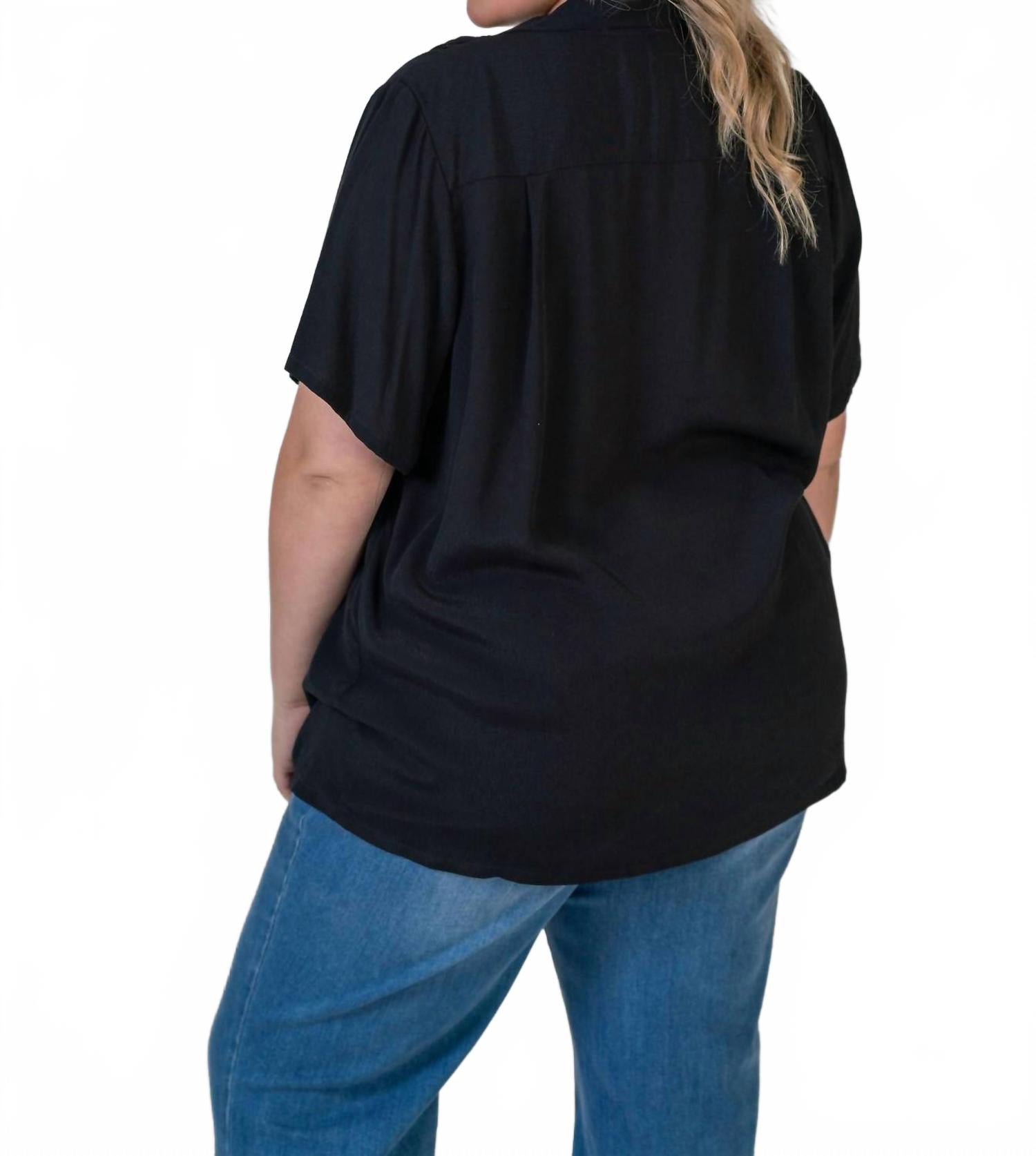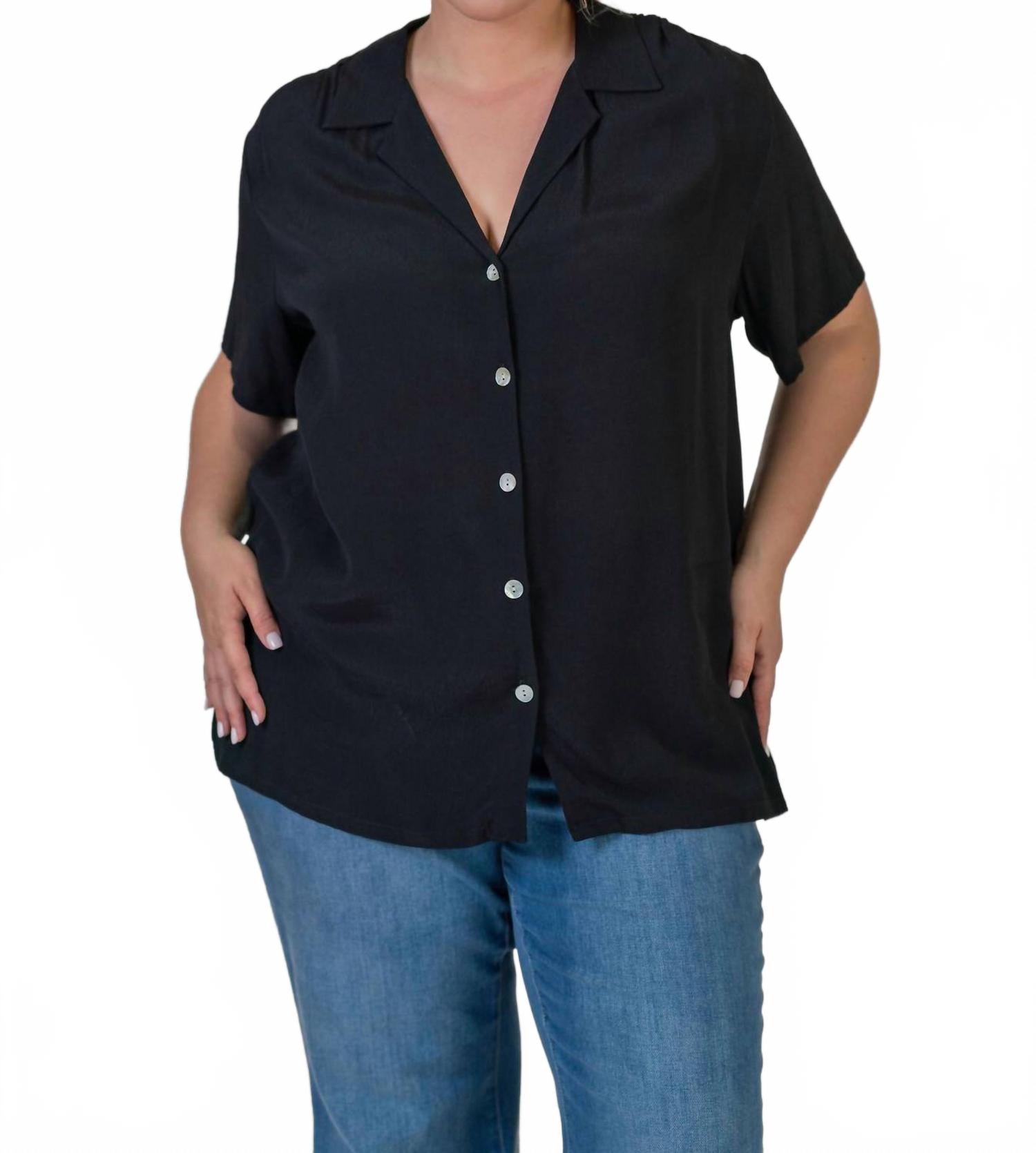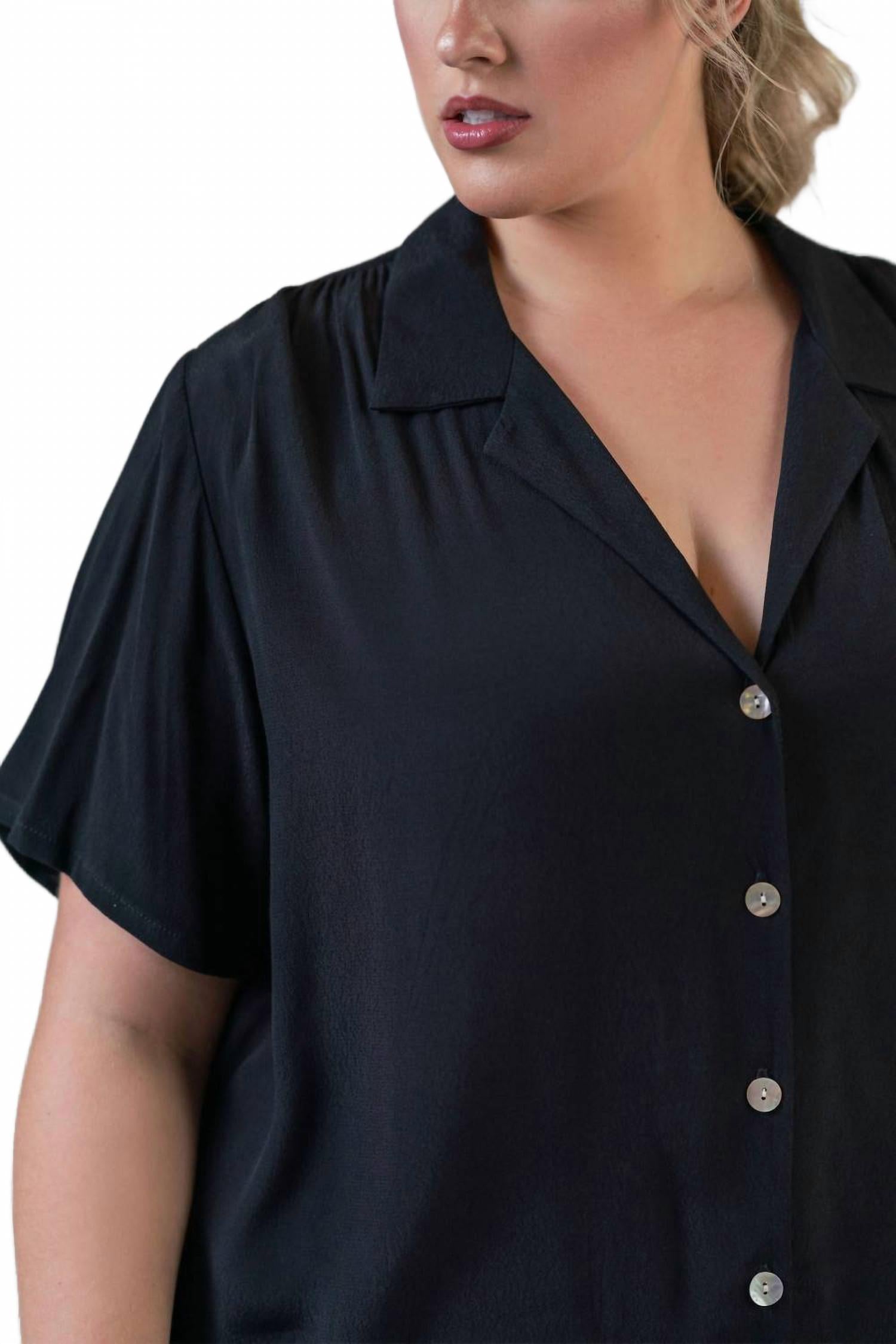 Ощутите непринужденную элегантность в рубашке Camp с короткими рукавами на пуговицах от Karen Kane из красивого фактурного крепа. Эта универсальная черная рубашка с отложным воротником и свободным силуэтом станет незаменимой вещью для любого летнего гардероба. Состав: 79% лиоцелл, 21% хлопок. Застежка: пуговицы. Уход: ручная стирка, сушка на веревке.