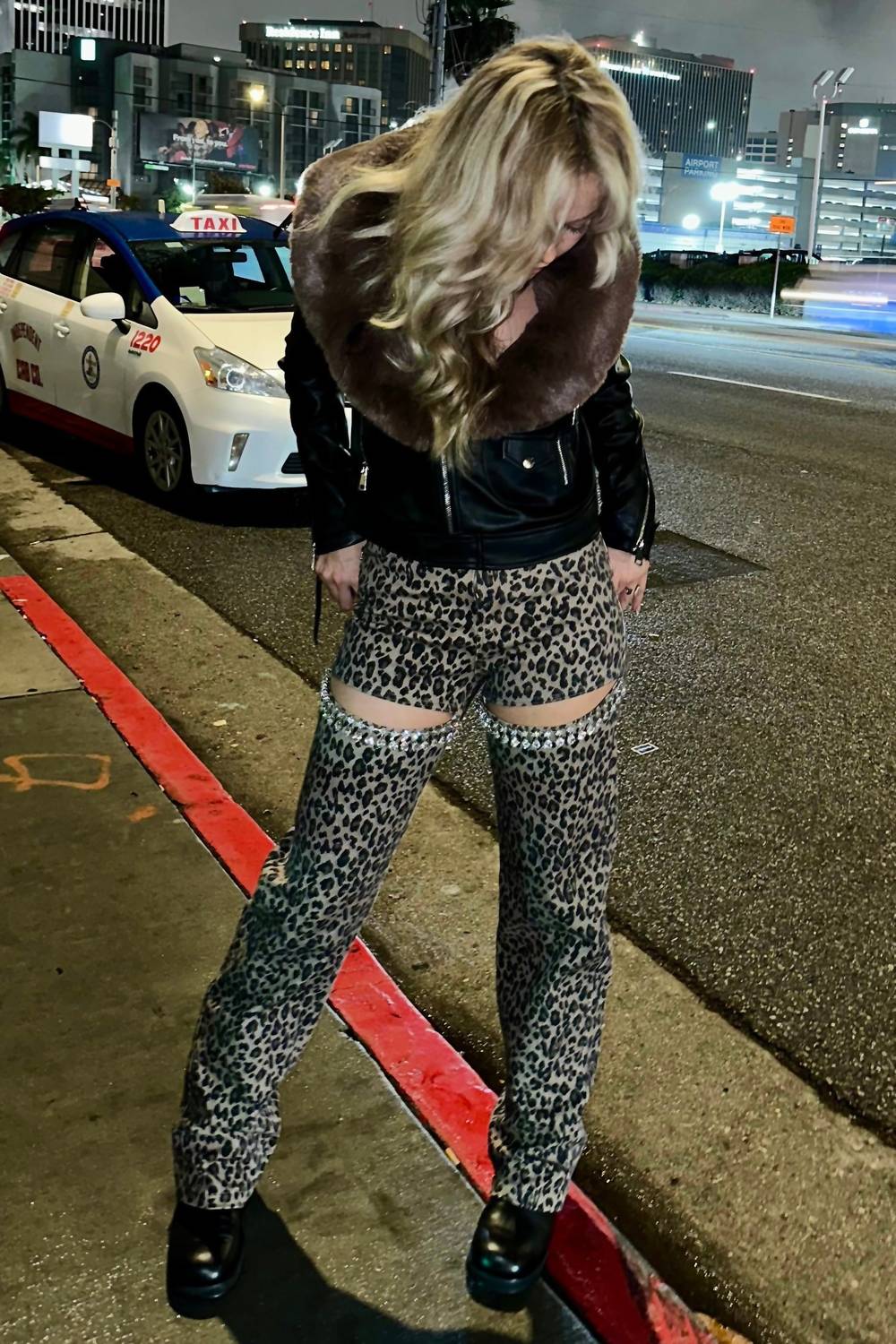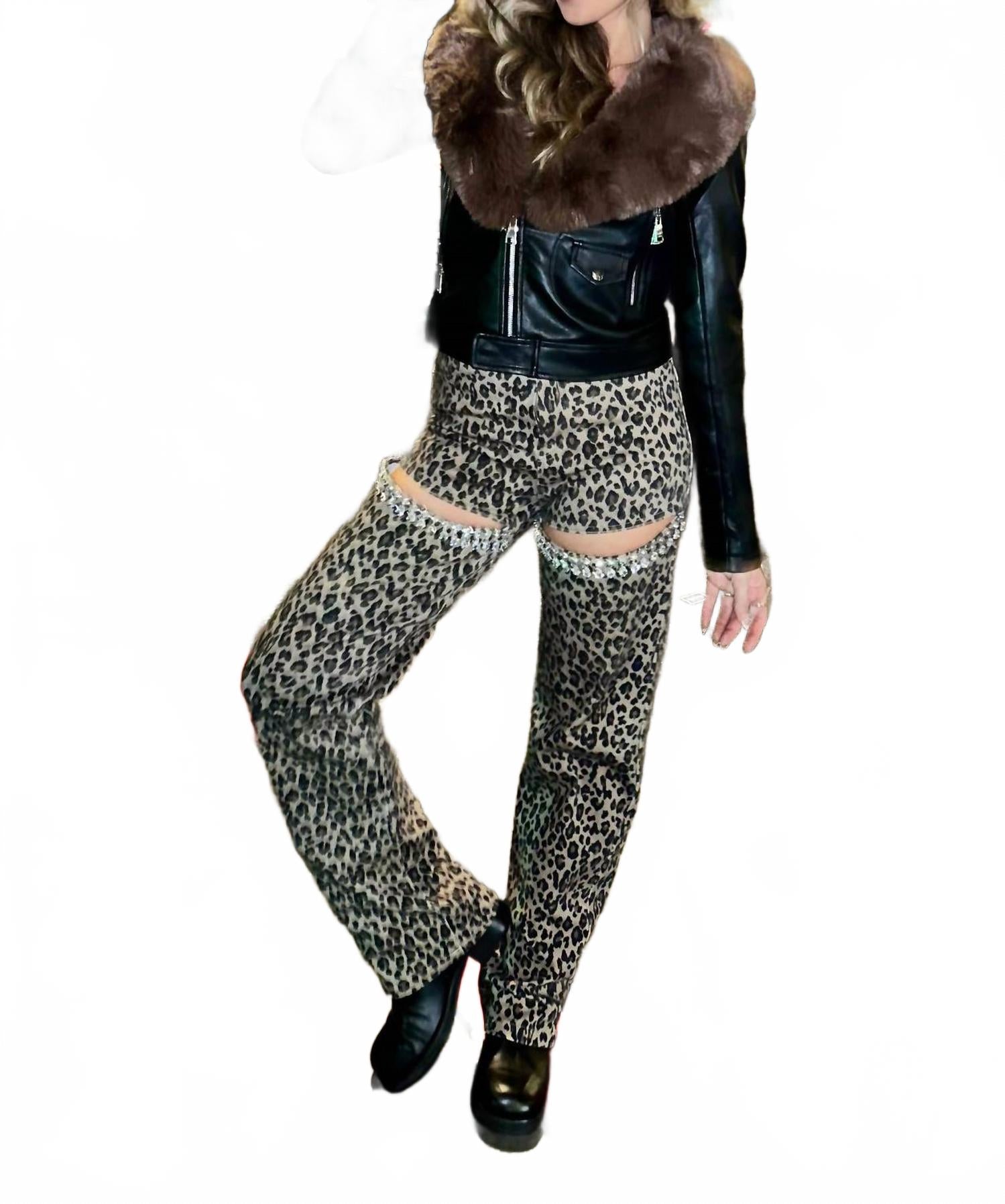 Окажитесь в центре внимания! Идеально подходит для создания яркого образа для осеннего концерта. Изготовлено из прочного денима. Широкие брюки с высокой посадкой и свободным кроем обеспечивают максимальный комфорт. Элегантные стразы и игривый анималистичный рисунок дополняют стиль, дополняемый практичными боковыми карманами и застежкой на пуговицы. Для сохранения яркой многоцветной отделки рекомендуется ручная стирка.