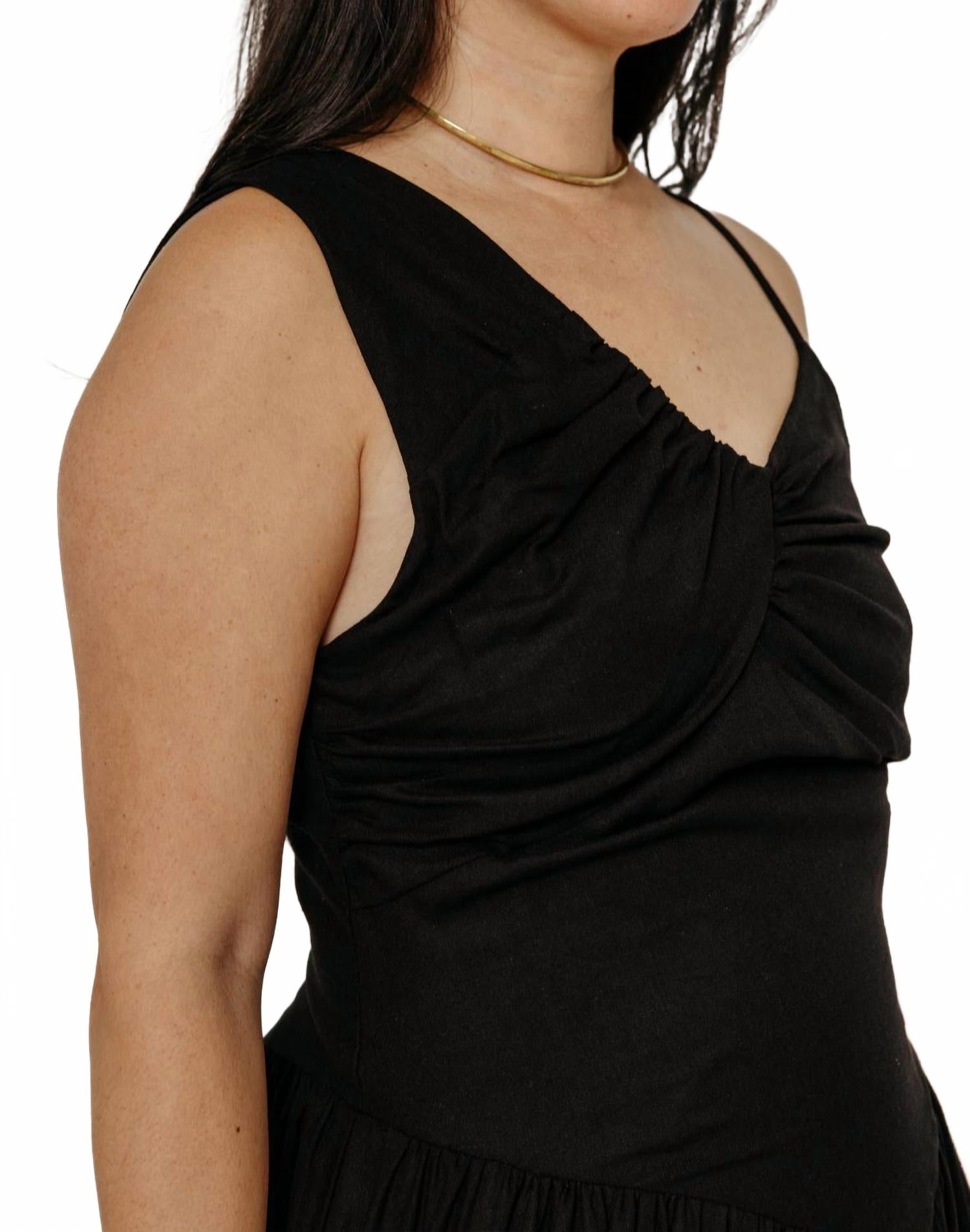 Кто не любит хорошее макси-платье? Это платье вы будете носить каждый сезон. Представляем льняное платье Chenoa от TACH - незаменимая вещь для летних помолвок. Это макси-платье без рукавов однотонного черного цвета с драпированным V-образным вырезом в сочетании с А-образным силуэтом излучает изысканность. Изготовленное из комфортной смеси 70% льна и 30% вискозы, оно создает ощущение роскоши. Застежка: потайная молния сзади.