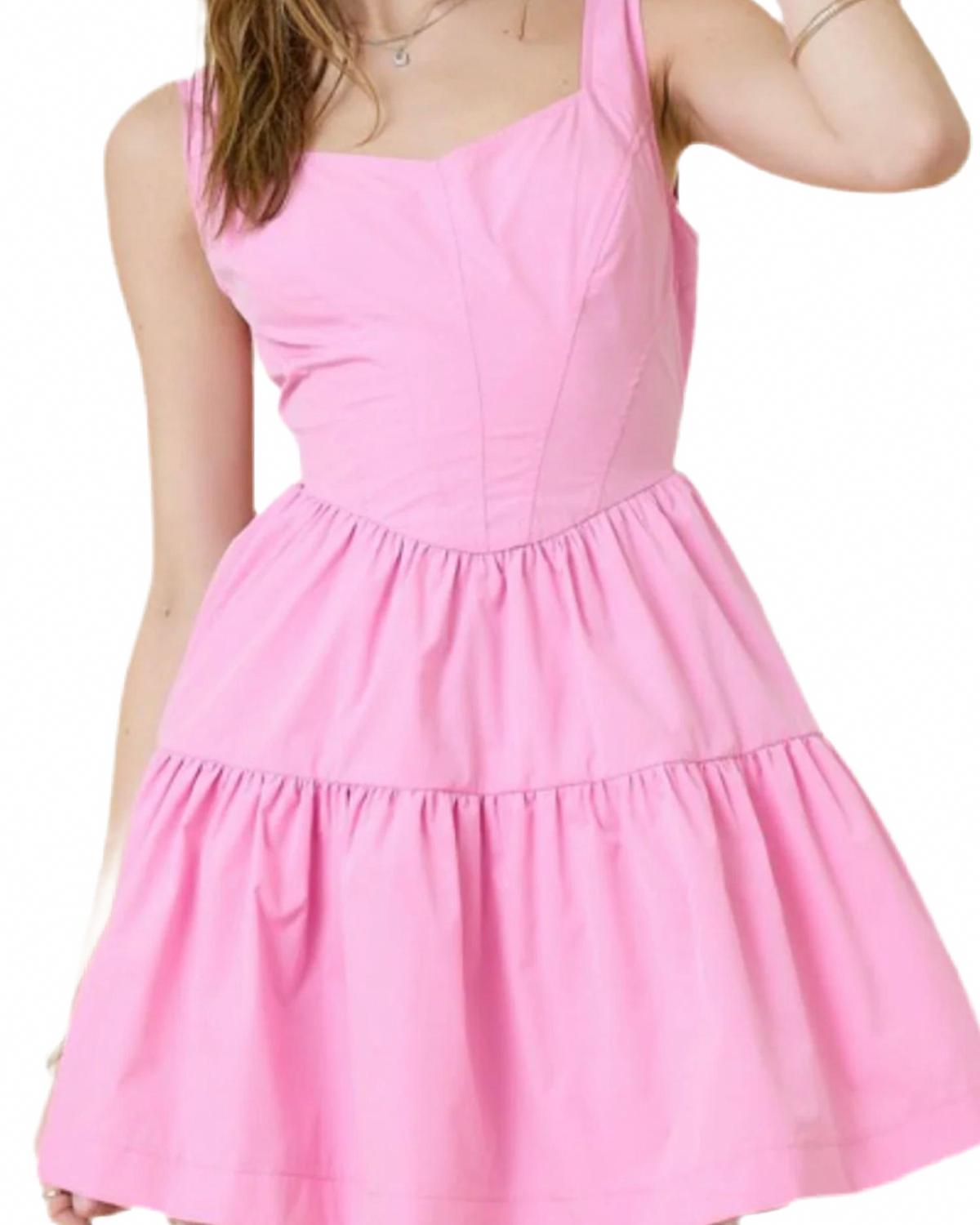 Платье Doll Baby от Day + Moon - стильный летний аксессуар нежно-розового оттенка, идеально подходящий для коктейльных вечеринок. Это мини-платье А-силуэта из легкого поплина с корсетным лифом и модными многоярусными оборками без рукавов обеспечит комфорт в теплую погоду. Платье с надежной застежкой-молнией сзади создаст непринужденный летний образ в однотонном стиле бохо-шик.