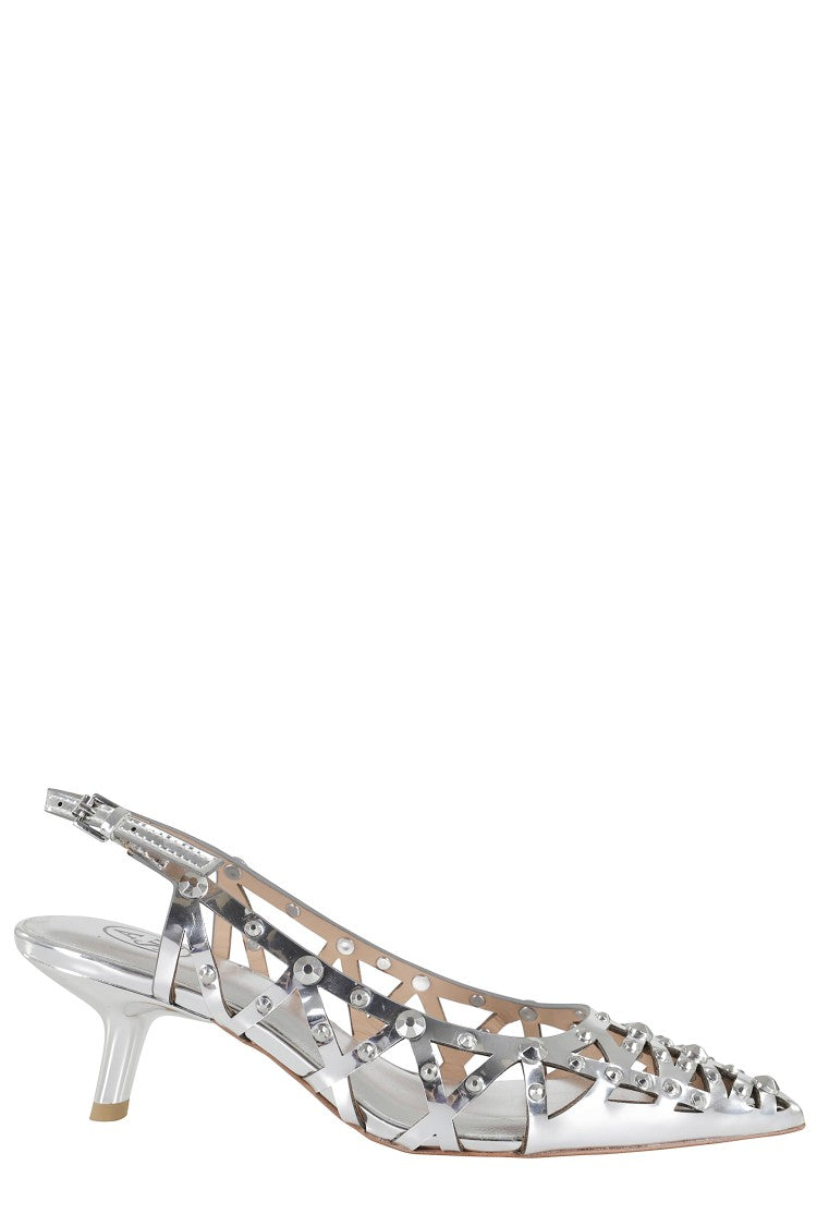 Туфли Ash с открытой пяткой и открытой пяткой отличаются очаровательным вырезом из зеркальной кожи с отделкой заклепками. Острый носок и регулируемый ремешок подчеркивают утонченный силуэт, а резиновый каблук обеспечивает комфорт и устойчивость.