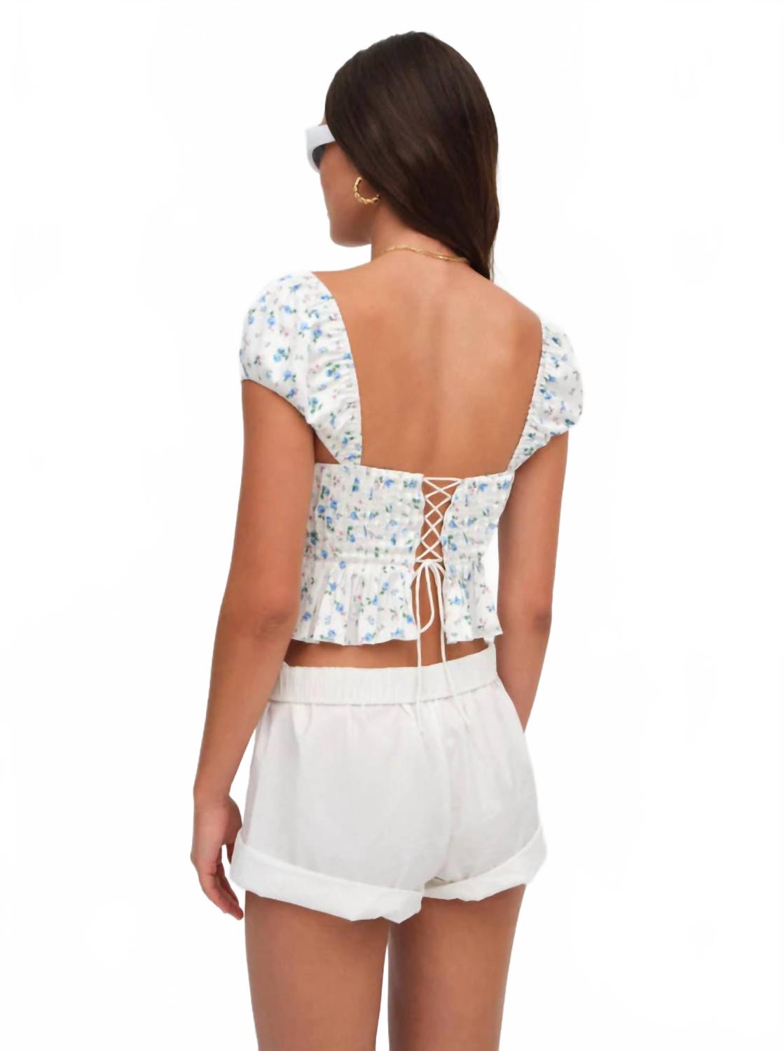 Идеальный укороченный топ для теплых дней. Представляем блузку Opal от For Love & Lemons - мечта для тех, кто обожает цветочные мотивы. Этот кремовый укороченный топ с короткими рукавами и романтичной кружевной отделкой по вырезу в форме сердечка выполнен в стиле корсета, подчеркивающего вашу фигуру. Материал: полиэстер. Застежка: завязка. Уход: только химчистка. Идеально подходит для пляжного образа в стиле бохо-шик.