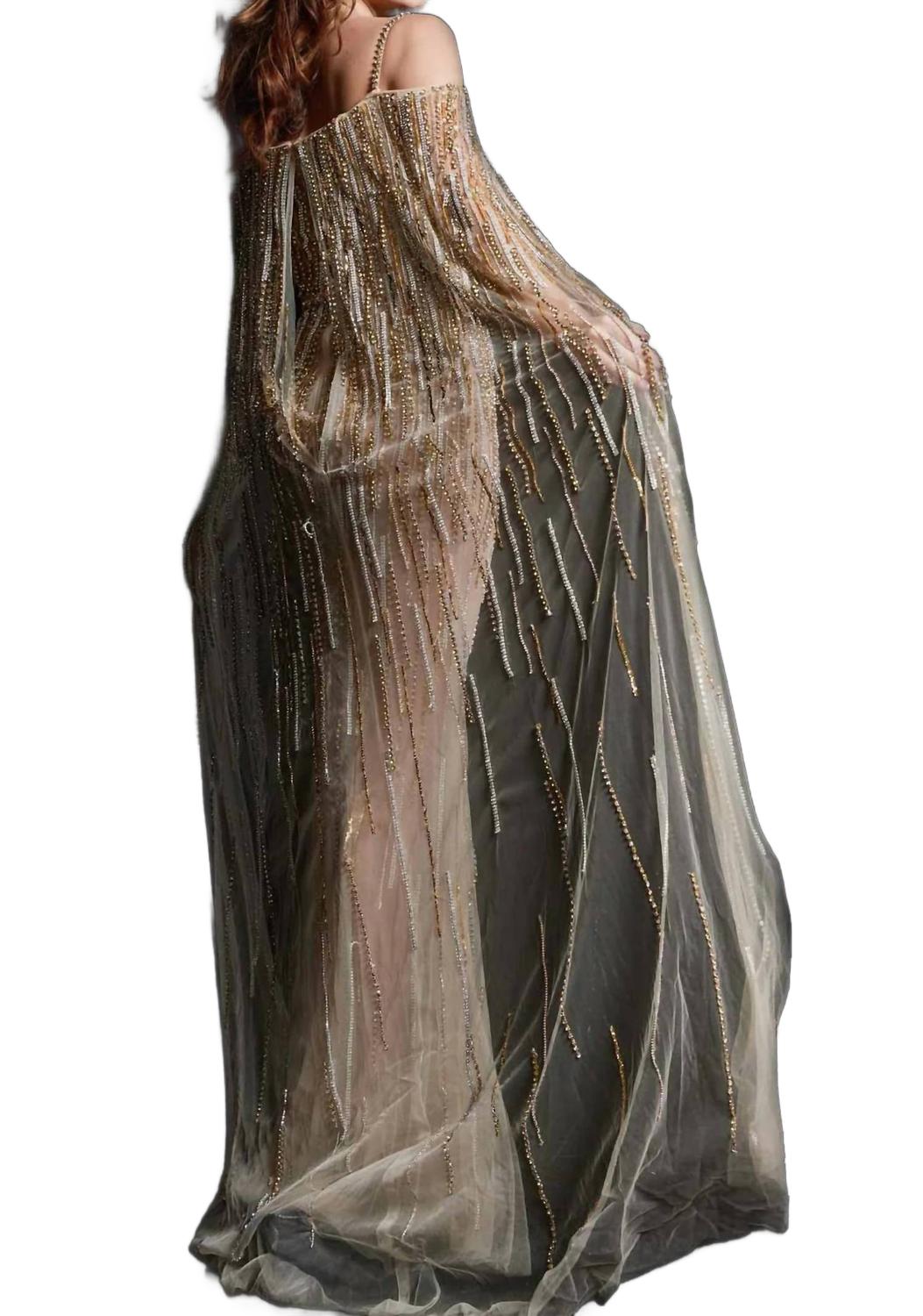 Это потрясающее платье силуэта «русалка» без бретелек с прозрачным лифом, украшенным изысканной вышивкой бисером, изысканно детализированной сверху донизу. Платье имеет приталенный силуэт от лифа и бедер, расширяясь к колену, и выполнено из нежной прозрачной ткани, которая красиво драпируется до пола.