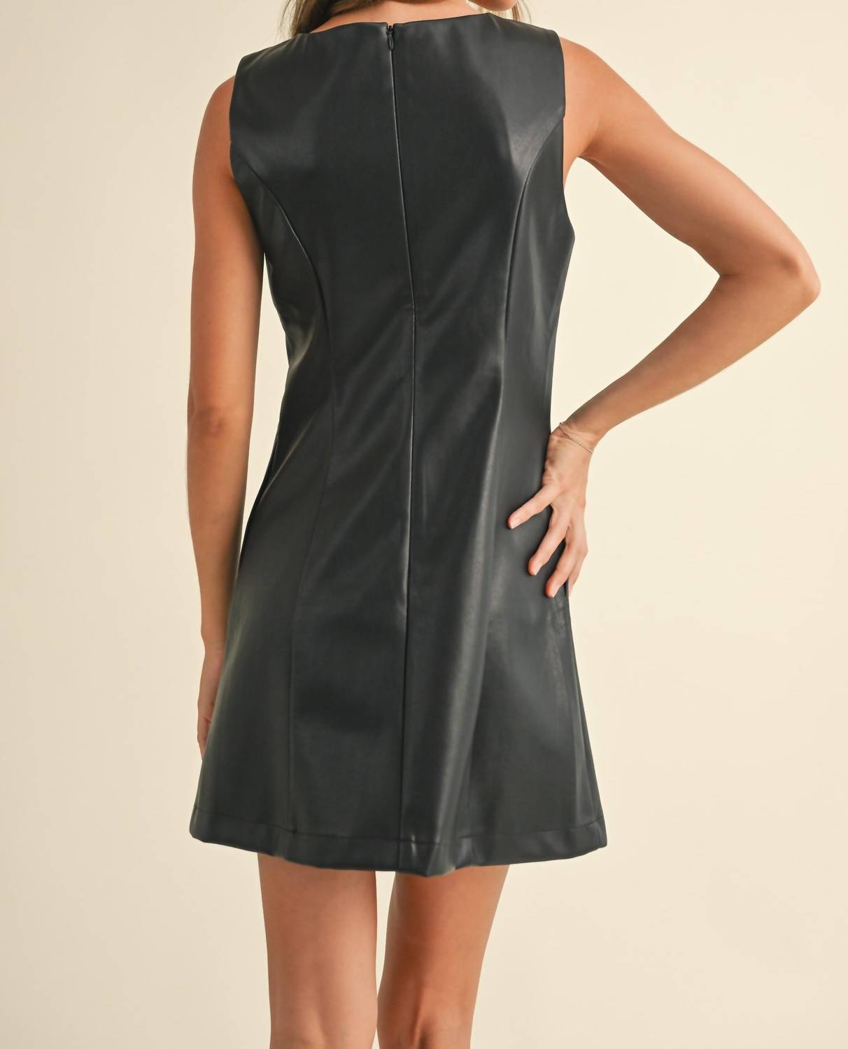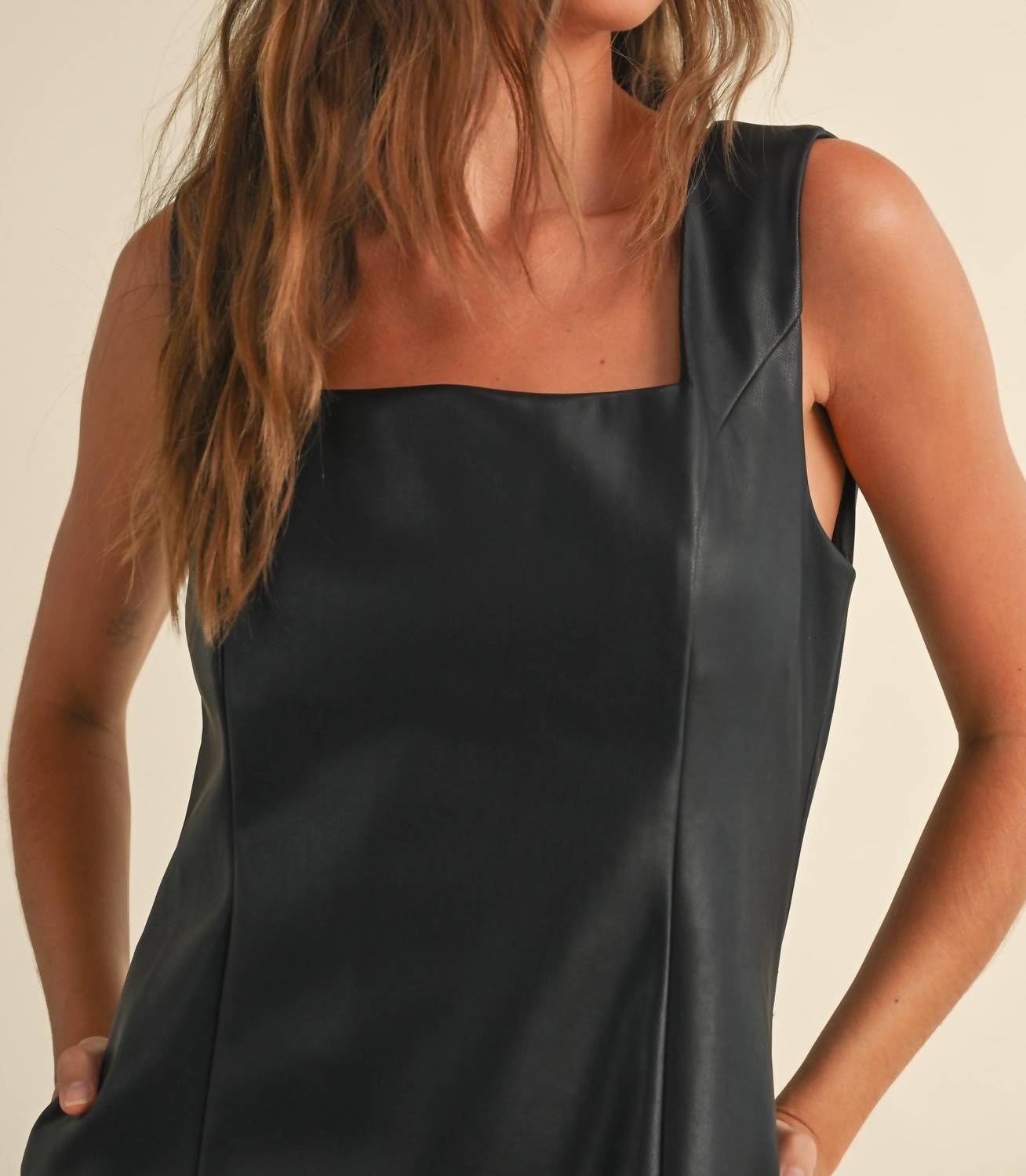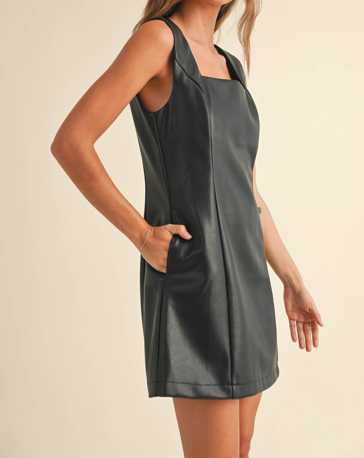 Идеальное мини-платье для теплых месяцев. Представляем платье Vivi от MIOU MUSE - шикарное мини-платье, которое станет незаменимой вещью в гардеробе любого модника. Это платье без рукавов А-силуэта из плотной черной искусственной кожи имеет изысканный квадратный вырез и удобную застежку-молнию. Карманы обеспечивают одновременно стильный и функциональный образ. Платье идет размер в размер, обеспечивая идеальную посадку.