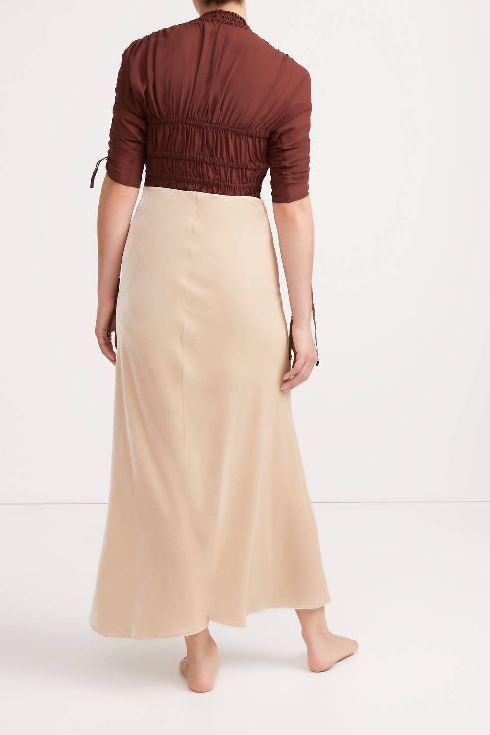 Sleeping with Jacques работает с натуральными волокнами, в частности, с шелком, поскольку он имеет низкий углеродный след. Эта макси-юбка из весенней коллекции 2021 года, выполненная из смесового шелка с бархатистой отделкой, имеет эластичный пояс для идеальной посадки и комфорта. Специальные швы подчеркивают силуэт «песочные часы». Состав: 82% вискоза, 18% шелк. Уход: химчистка.