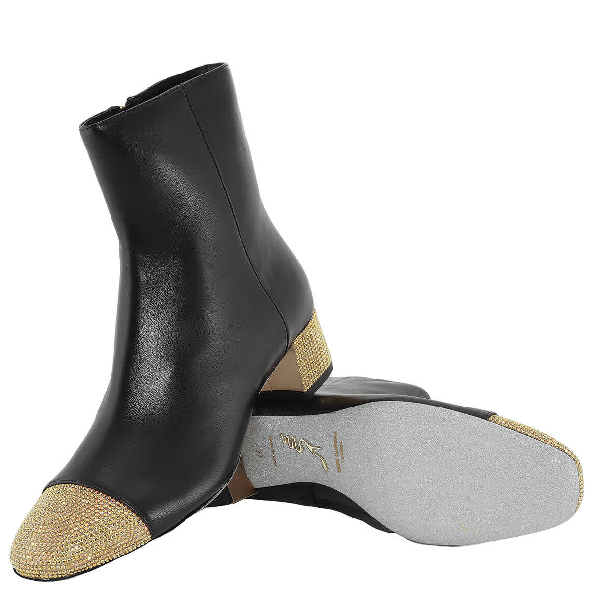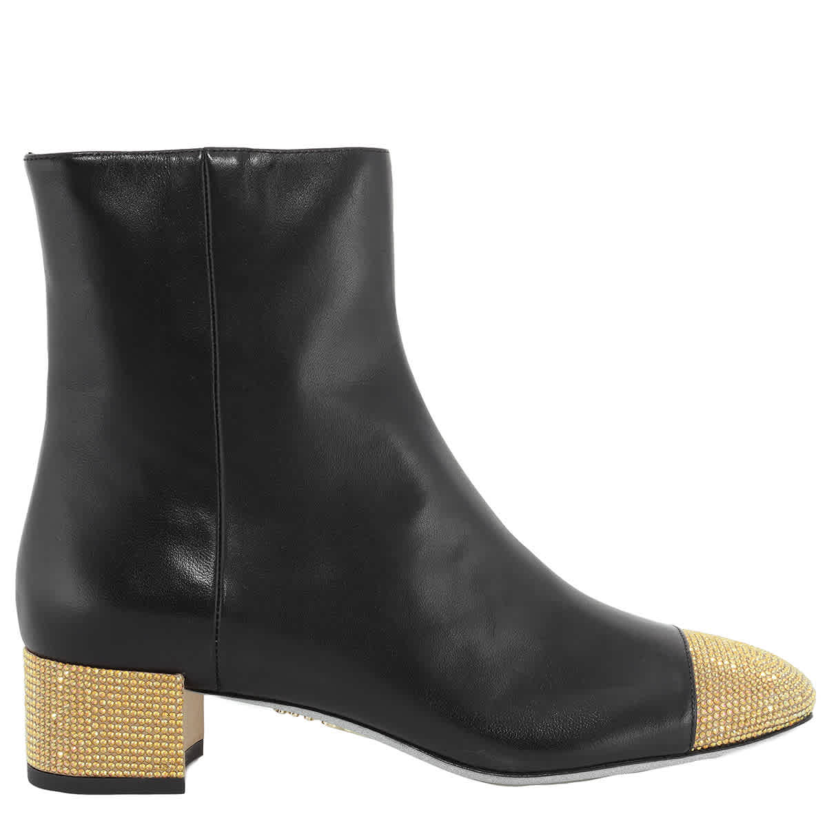 Женские ботильоны Rene Caovilla.ME. Цвет: черный ягненок/C.Met.Sunshine Strap. Кожаные ботильоны Rene Caovilla Bonnie 40. Ботильоны Bonnie изготовлены из кожи, имеют круглый носок, застежку-молнию сбоку. Ботильоны украшены стразами, пришитыми вручную, и имеют блочный каблук высотой 1,5 дюйма. Сделано в Италии.