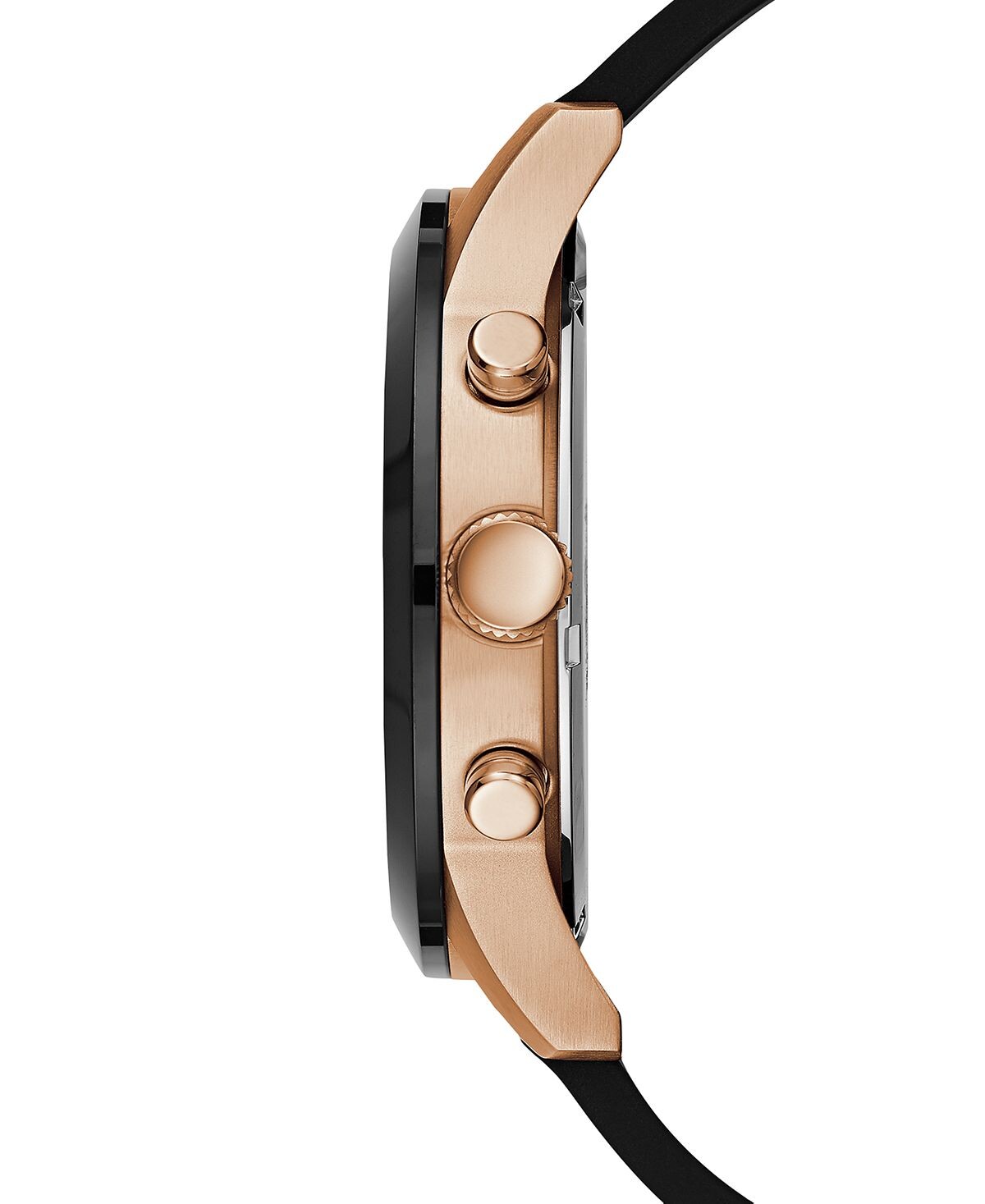 Жирные римские цифры и смещенные дополнительные циферблаты подчеркивают современную привлекательность часов GUESS в оттенках черного и розового золота.