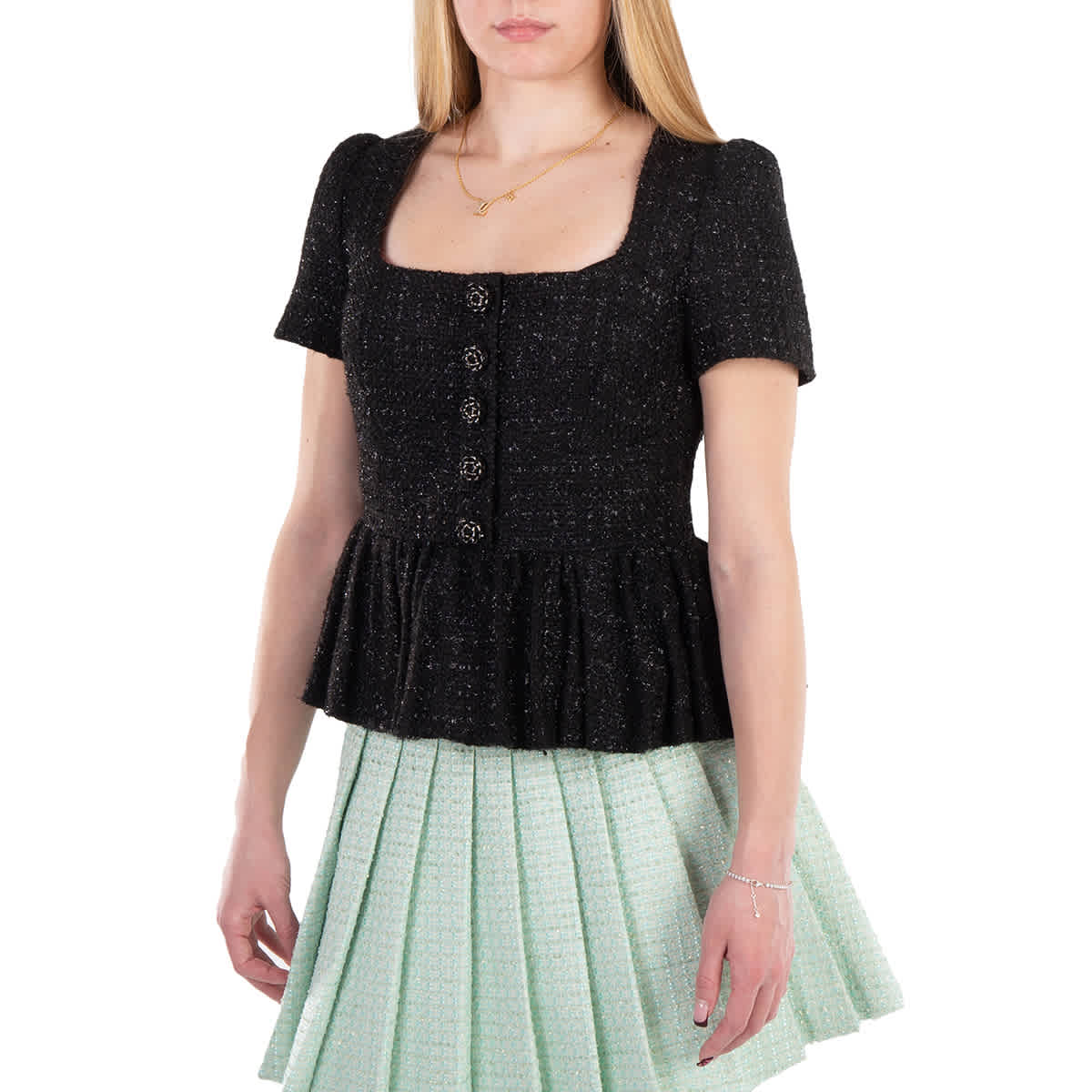 Женский топ Self Portrait. Категория: Рубашки и блузки. Цвет: черный. Черный топ Self Portrait из букле с баской. Этот топ из букле застегивается на пуговицы спереди и украшен пуговицами, расшитыми кристаллами и пайетками. Он выполнен из твида с металлизированными нитями и оборкой по низу. Состав: 86% полиэстер, 5% металлизированное волокно, 4% хлопок, 3% вискоза, 1% акрил, 1% полиамид.