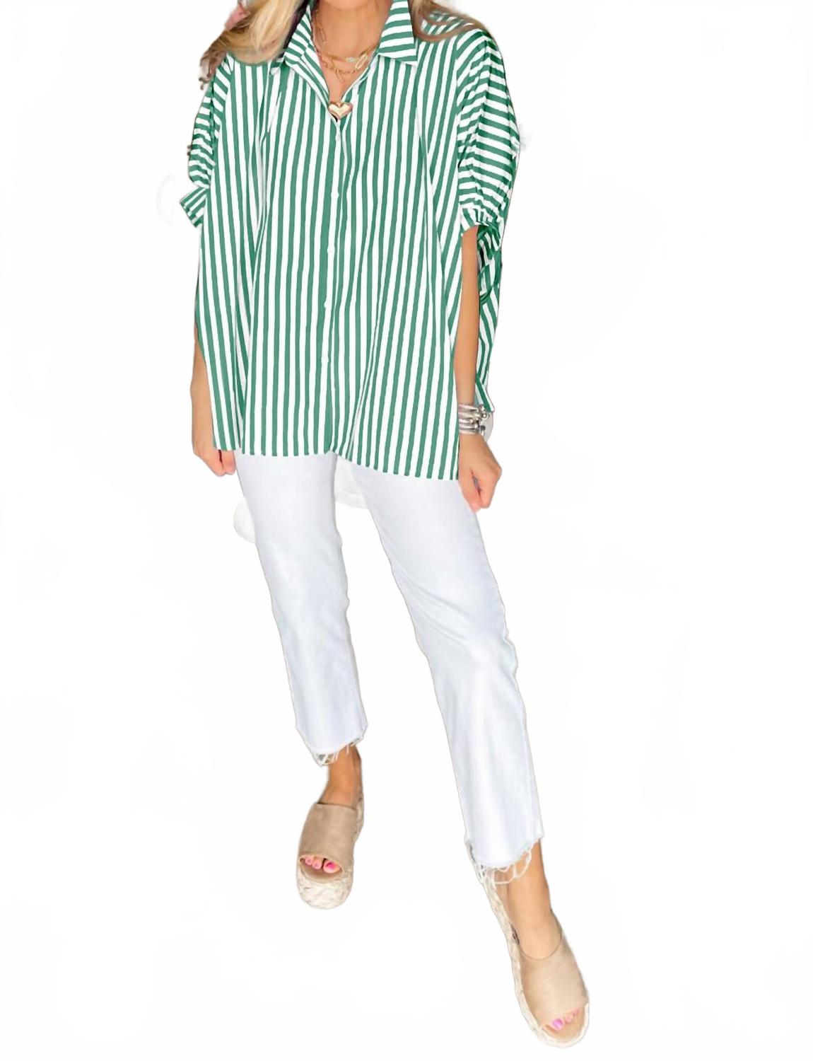 Представляем топ «Долман» от Shewin - яркое дополнение к любому летнему гардеробу. Эта женская блузка с рукавами до локтя и классическим воротником обеспечивает свободный крой для максимального комфорта. Изготовленная из хлопка, она украшена яркими зелеными полосками и фасоном «летучая мышь», который прекрасно сочетается с белыми джинсами.