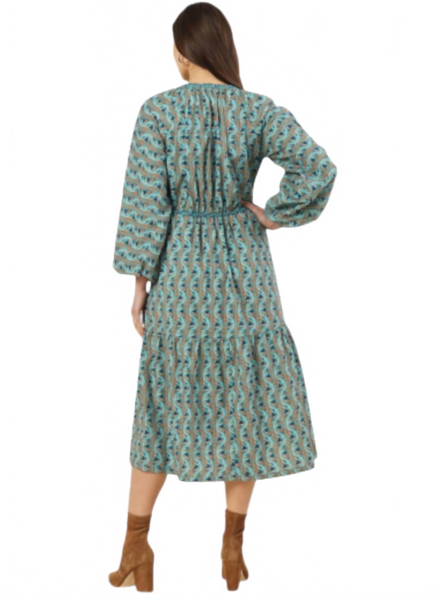 Идеально подходит для праздничной вечеринки. Платье с длинными рукавами и стилизованным узорчатым принтом, свободный фасон пуловера, V-образный вырез с воротником и застежка на пуговицы спереди. Длина миди, талия регулируется шнурком, что делает силуэт облегающим, сохраняя при этом комфорт. Застежка на пуговицы. Ручная стирка.