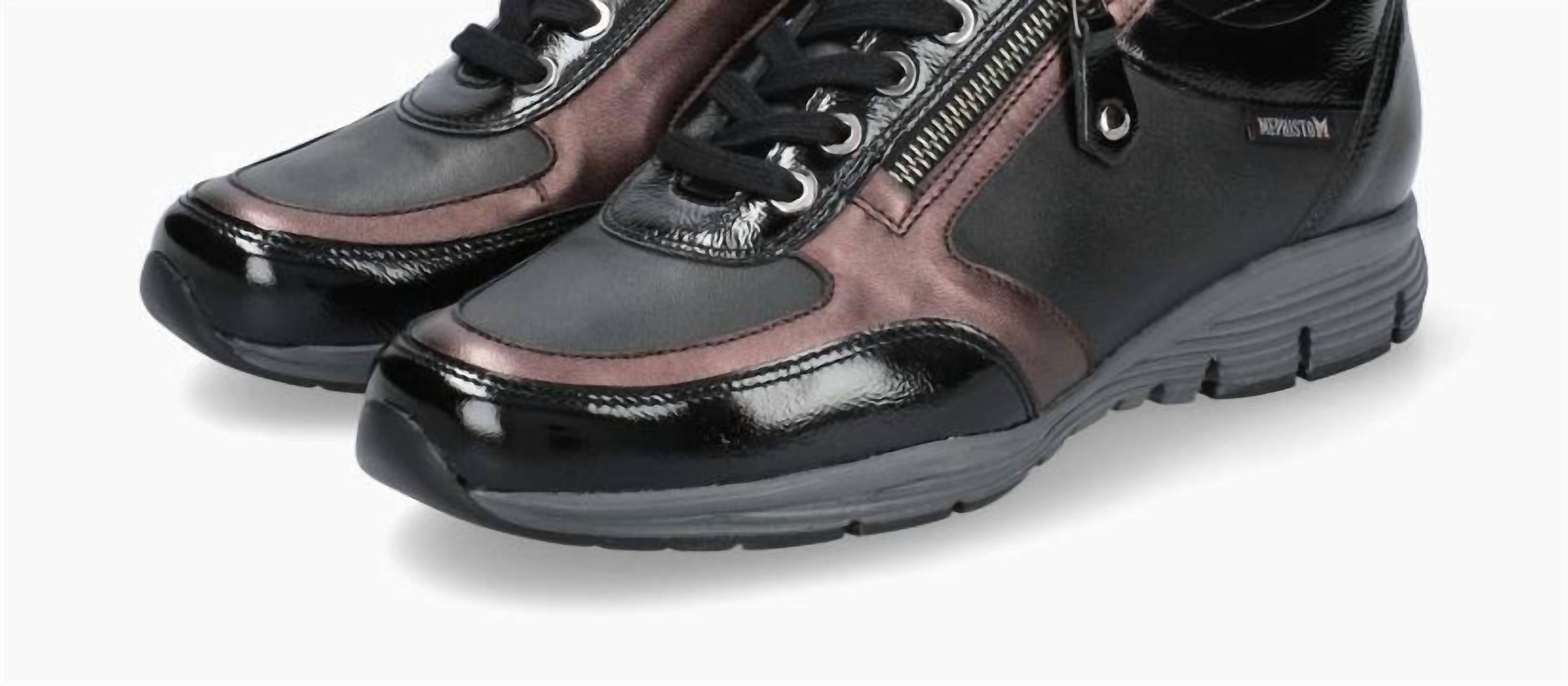 Созданы для максимальной легкости и комфорта. Верх из жатой лакированной кожи с гладкими кожаными вставками и металлическим эффектом создает шикарный образ. Лакированная кожа с кожаной подкладкой обеспечивает здоровый микроклимат внутри. Застежка-молния и шнуровка. Плоский каблук высотой 1 см. Съемная стелька и закругленный носок.