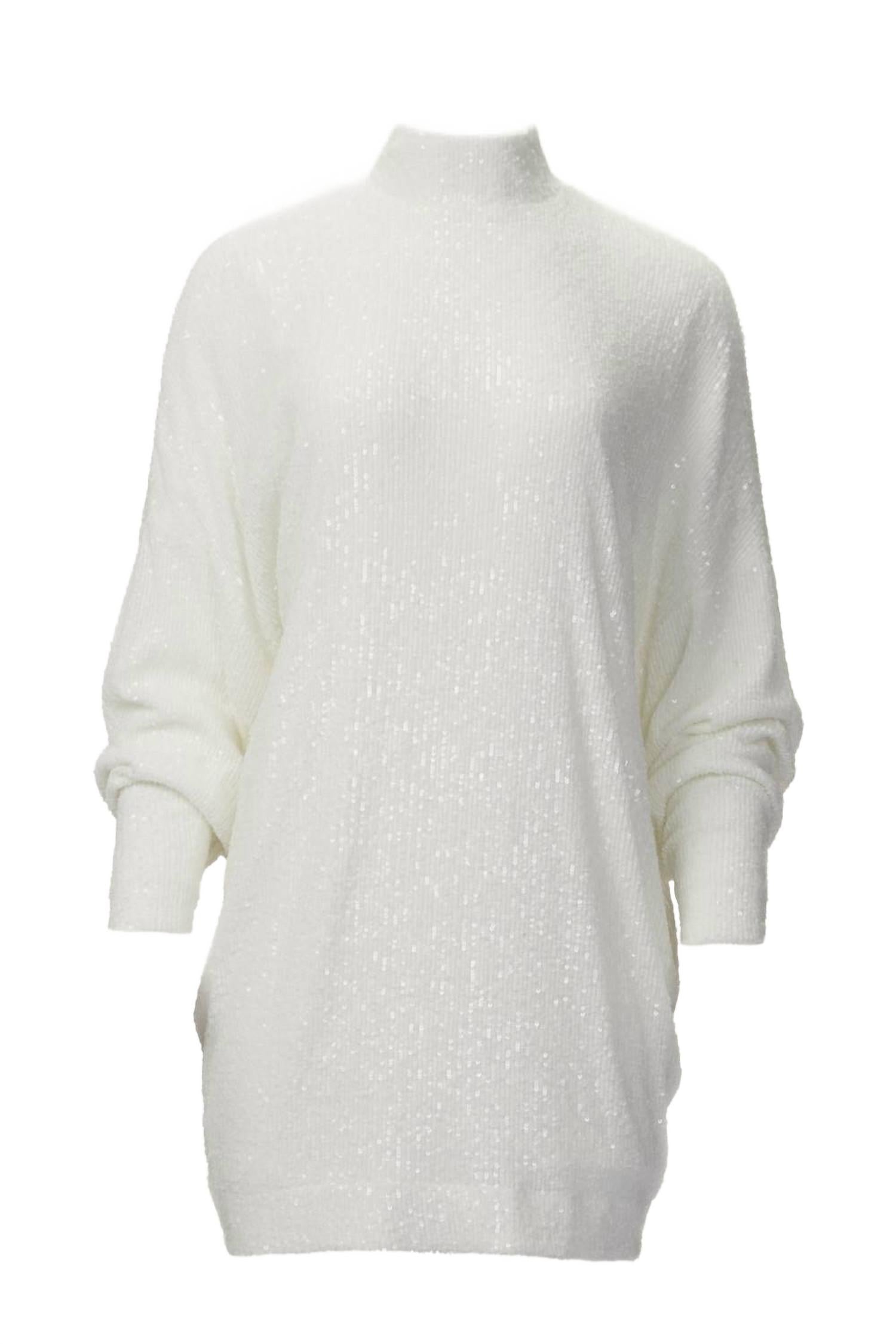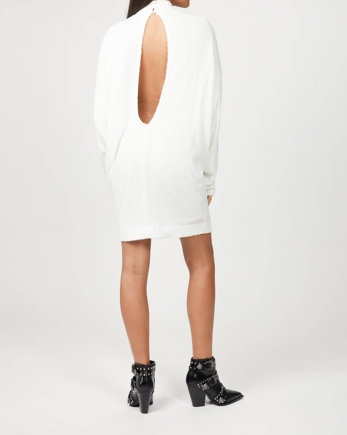 Платье Marceau, расшитое металлизированными белыми пайетками. Высокий вырез, длинные рукава «летучая мышь», свободный силуэт. Сзади застежка на три пуговицы.