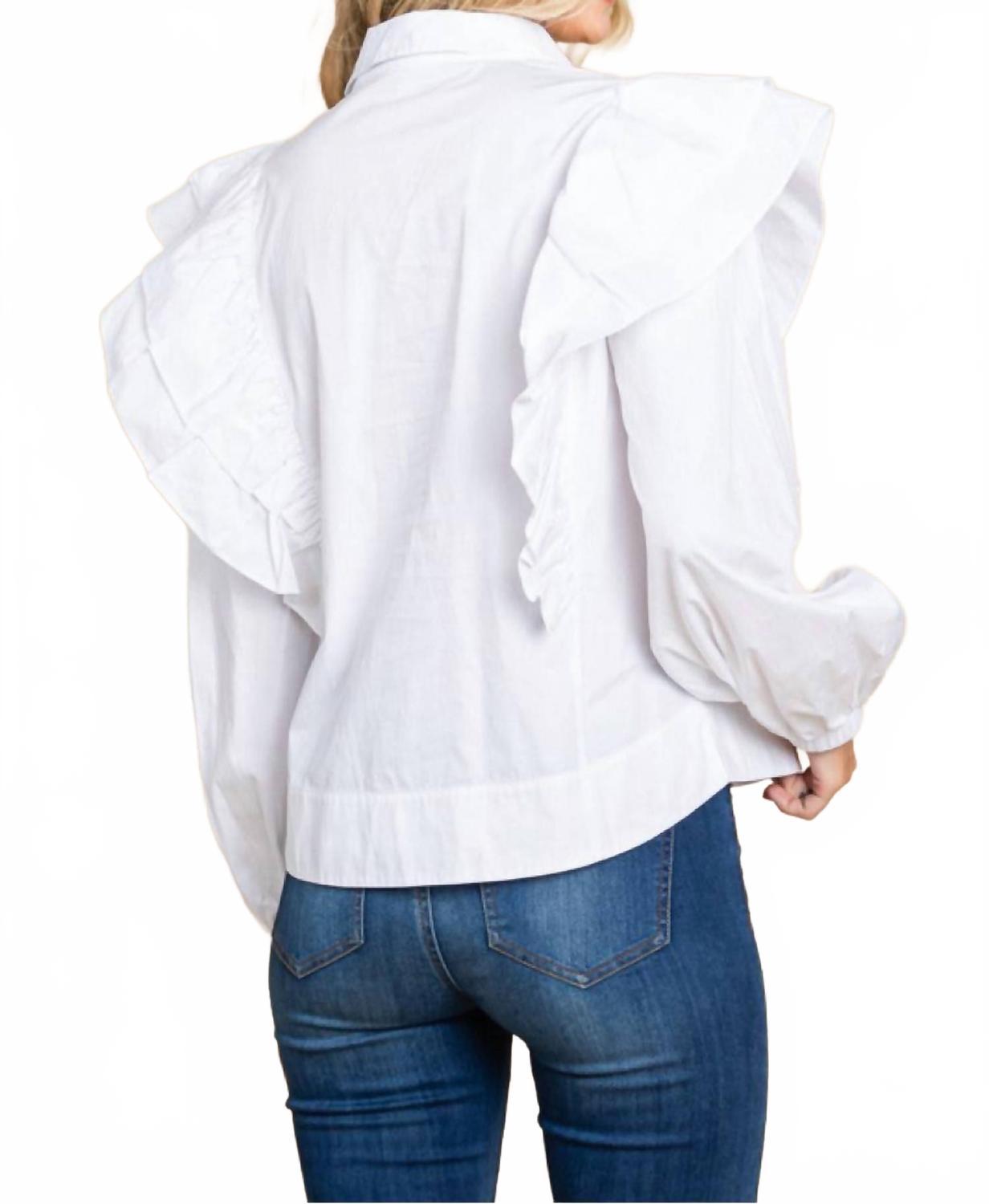 Идеально сшитый и мягкий на ощупь. Дополните свой весенний гардероб однотонным топом Jodifl с воротником-стойкой классического белого цвета. Этот топ с длинными рукавами в стиле «крестьянин», воротником-стойкой и многослойными оборками на плечах создан для элегантности и комфорта. Легкая, непрозрачная ткань с манжетами-резинками и разрезом по низу обеспечивает универсальность и удобство. Застежка: пуговицы.
