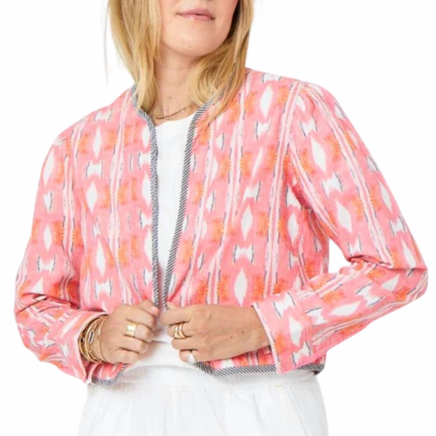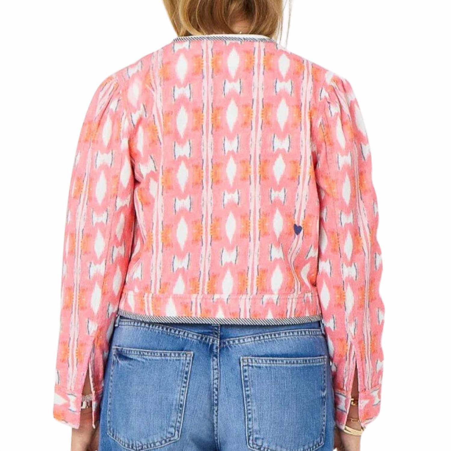 Куртка настолько универсальна, что ее можно носить буквально с чем угодно. Украшена фирменным принтом Kerri «Икат» в ярких коралловых, розовых, серых и белых тонах. Контрастная полосатая отделка. Подчеркивает вырез горловины, центральную часть переда и подол. Объемные плечи. Застежка на крючок по центру спереди обеспечивает идеальную посадку. Размер в размер. Можно стирать в стиральной машине. 100% хлопок.