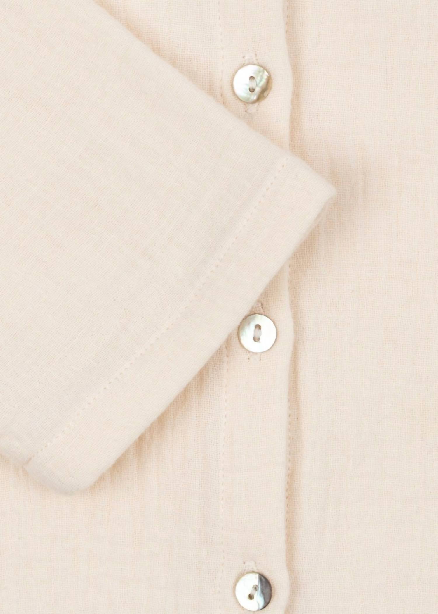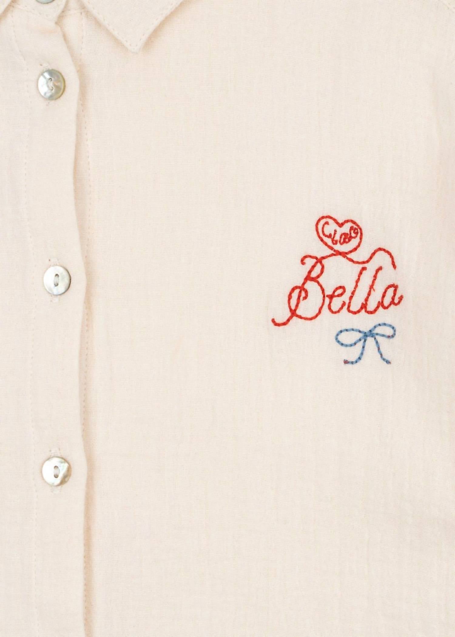 Представляем женскую рубашку Konges Sløjd Bella - классический боди, идеально подходящий для летних прогулок. Эта рубашка, выполненная из легкого муслина из 100% органического хлопка, имеет свободный крой, спущенные плечи и стандартный воротник, украшенный перламутровыми пуговицами. Сделано в Индии. Изящный бант и фирменная надпись «Ciao Bella» спереди придают рубашке особый шарм. Уход: машинная стирка.