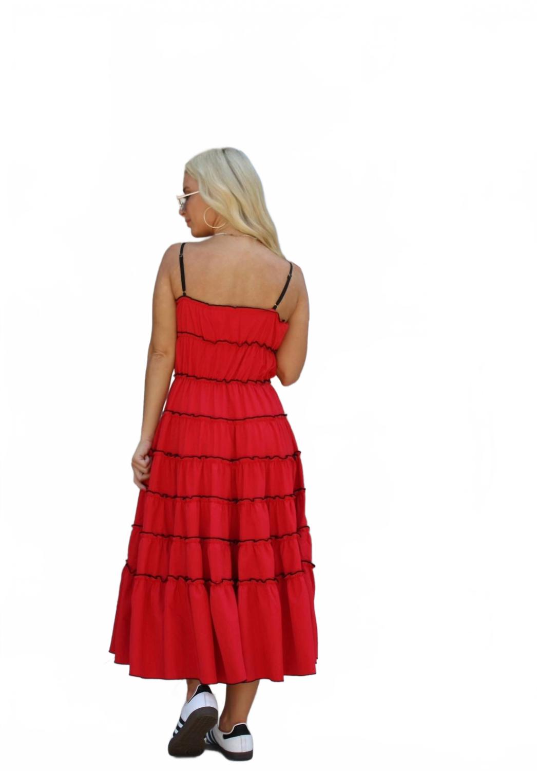 Эффектное платье-футляр ярко-красного цвета, созданное для создания яркого образа. Тонкие бретельки, многослойная отделка рюшами и контрастная отделка - идеальный вариант для игр или праздничных вечеринок. Состав: 100% хлопок. Модель легко надевается. Стирать вручную. Рост модели: 168 см, обхват груди: 86 см, обхват талии: 68 см. На модели размер S.