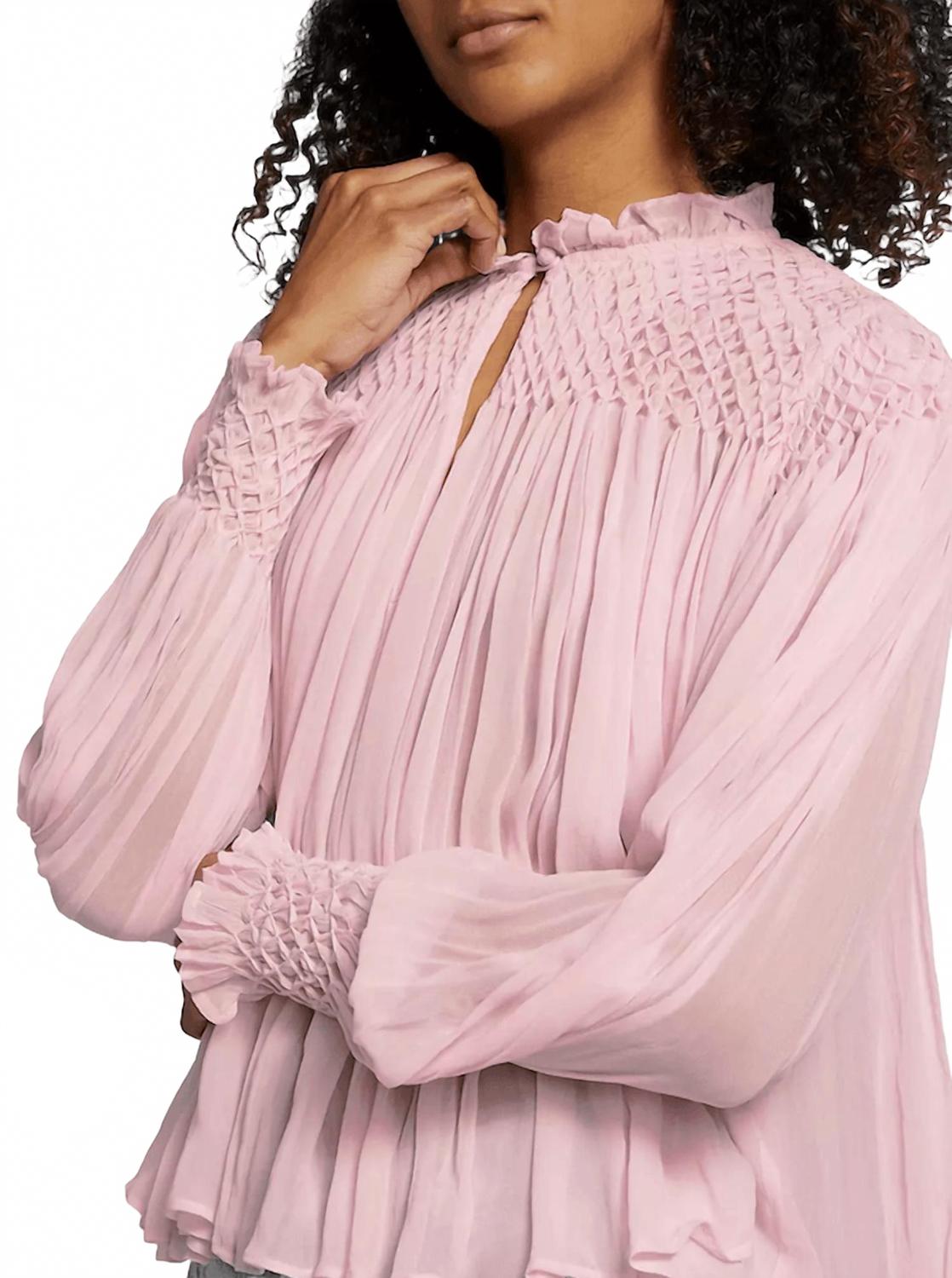 Эта блузка с элегантными длинными рукавами «бишоп» и присборенными манжетами полностью выполнена из роскошной вискозы. Высокий воротник с оборкой, вырез-замочная скважина спереди, плиссировка на спинке и застежка на пуговицы спереди. Для сохранения безупречного качества эту импортную модель следует подвергать только химчистке.