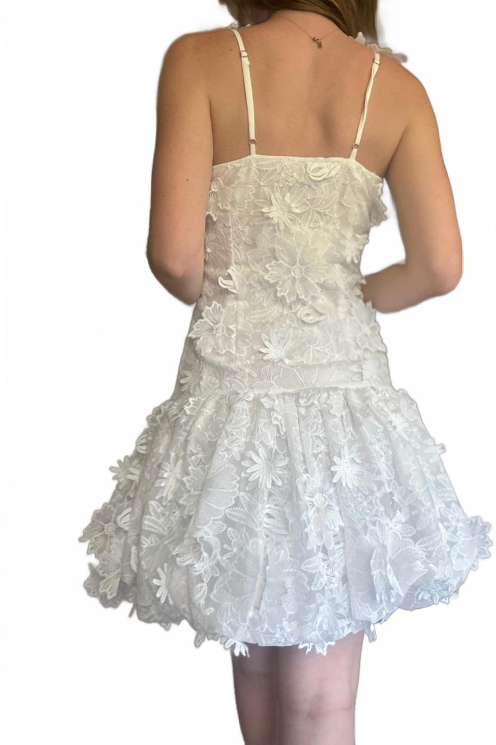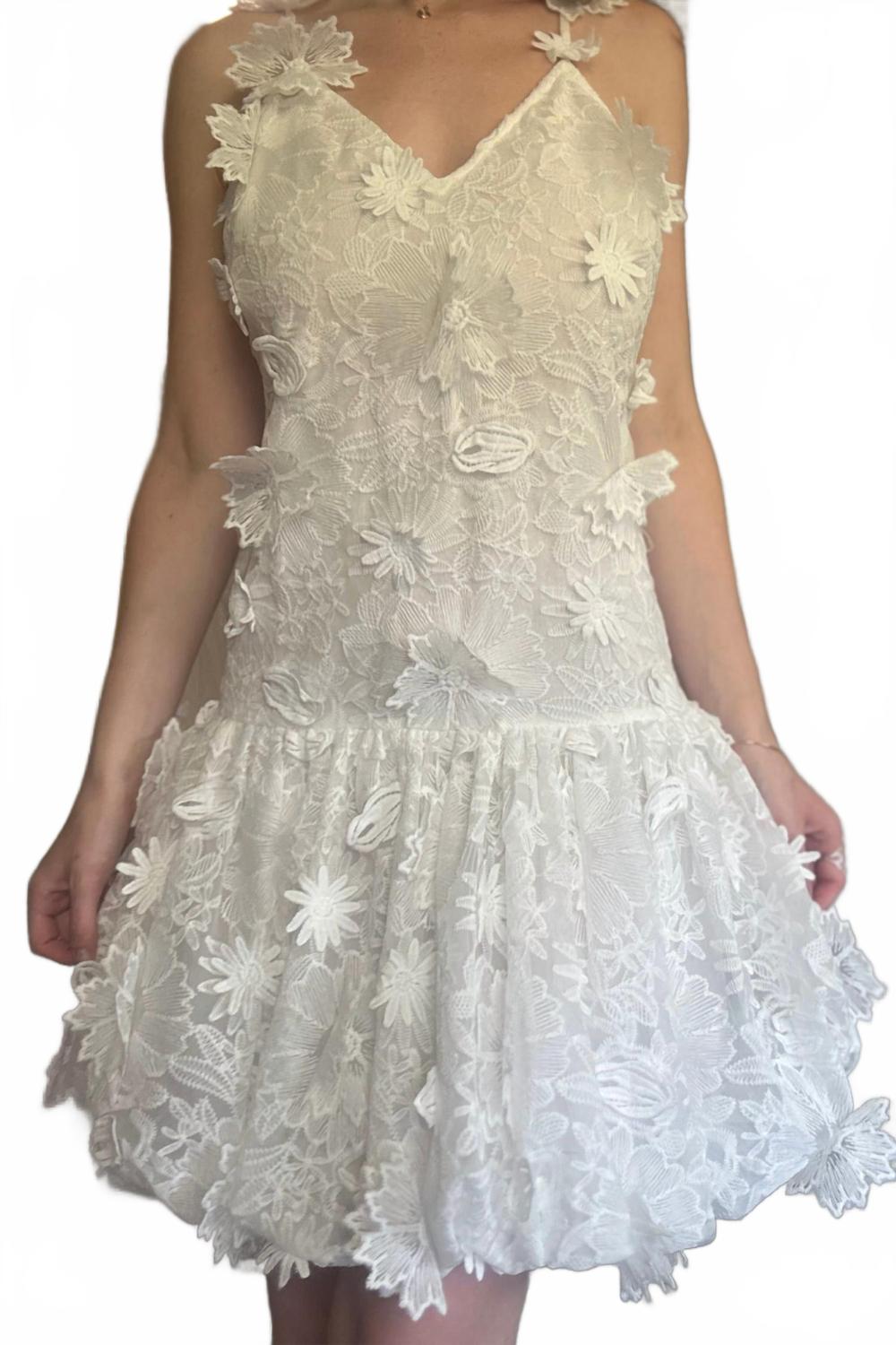 Ощутите непринужденную элегантность в мини-платье Moon от Let Me Be, идеально подходящем для летних свадеб. Это белое мини-платье без рукавов имеет А-силуэт со стильным V-образным вырезом, украшенным красивым объемным цветочным узором. Заниженная талия и пышный подол придают этому платью неповторимый шарм.