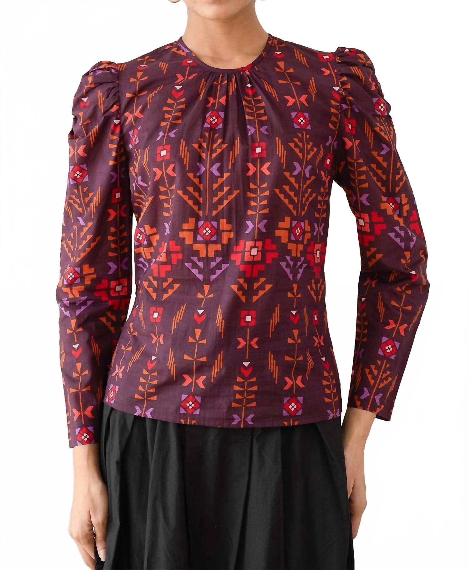 Украсьте свой гардероб топом Vincent от BANJANAN, ярким образцом цвета корицы Emilie Deco. Эта женская блузка с круглым вырезом и длинными рукавами украшена очаровательным геометрическим узором. Удобная в использовании, допускает машинную стирку. Идеально подходит для придания нотки художественной элегантности любому образу. 100% хлопок.