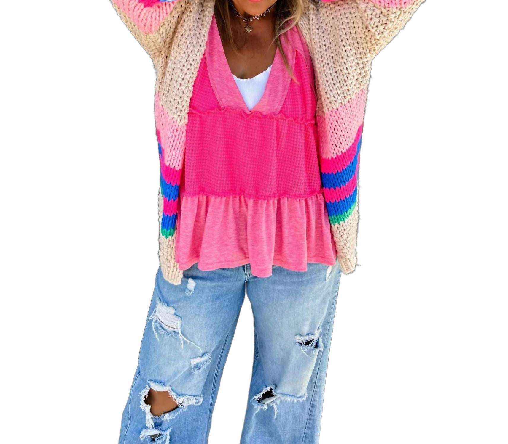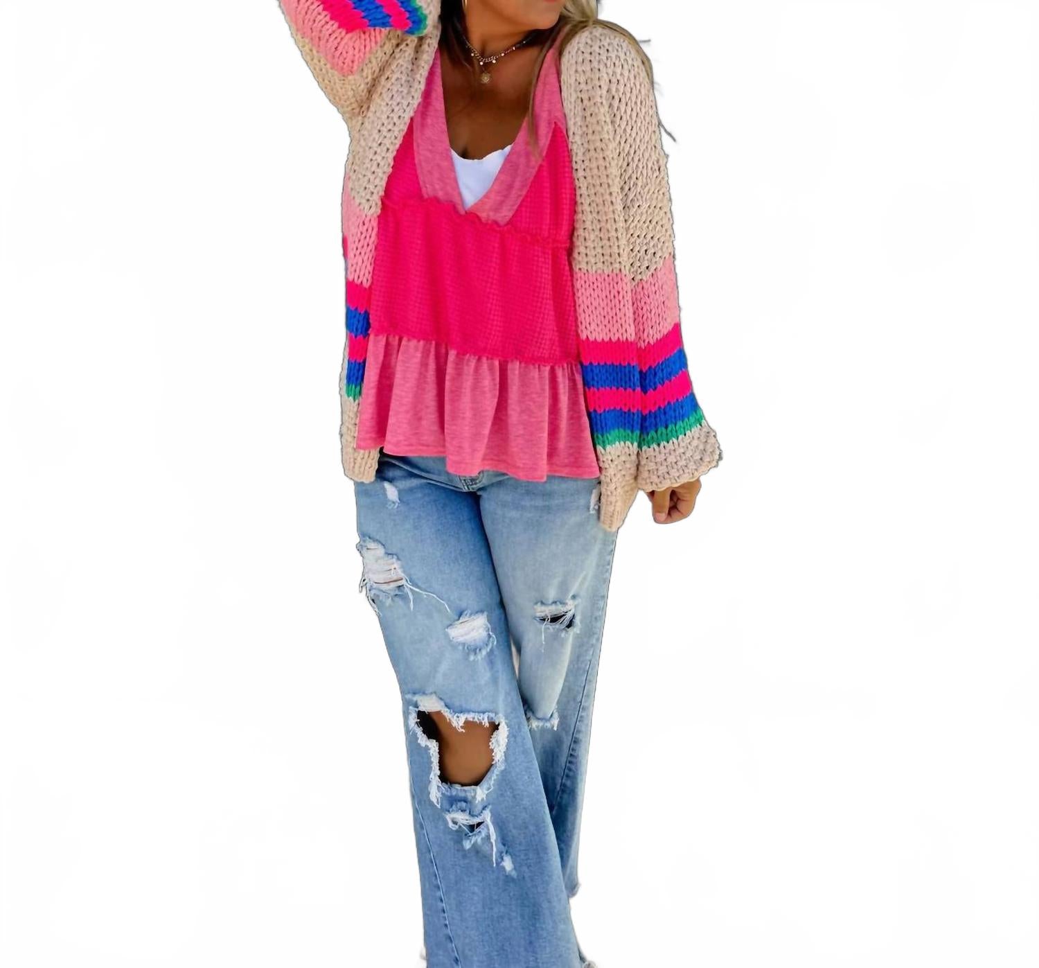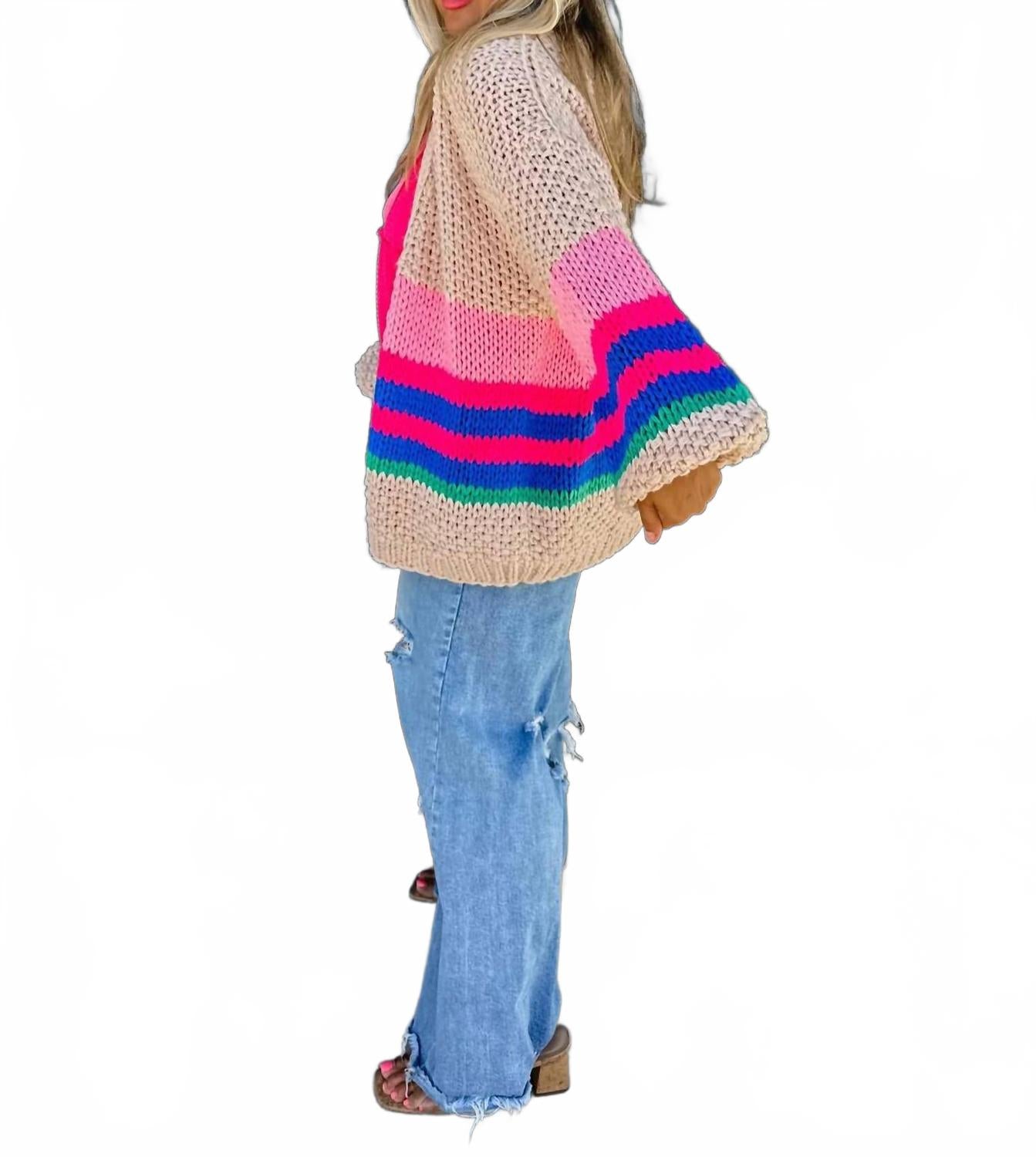 Идеально подходит для уличной моды осенью и путешествий. Женский кардиган с длинными рукавами-фонариками и V-образным вырезом. Изготовлен из эластичного акрила. Украшен модным полосатым узором и удобной застежкой-липучкой. Для сохранения приятной текстуры кардигана рекомендуется ручная стирка.