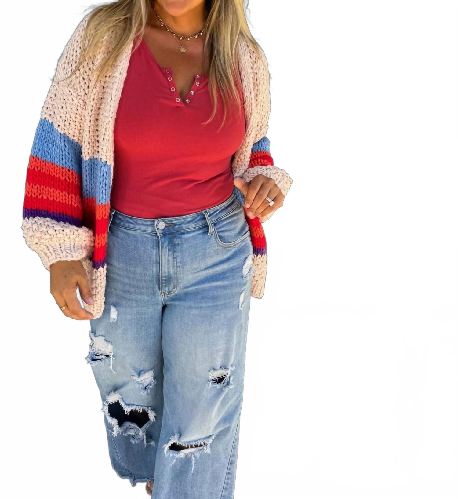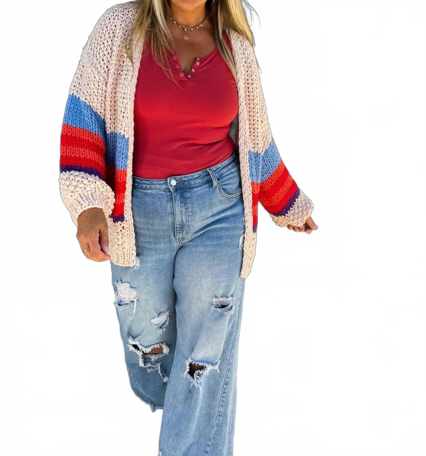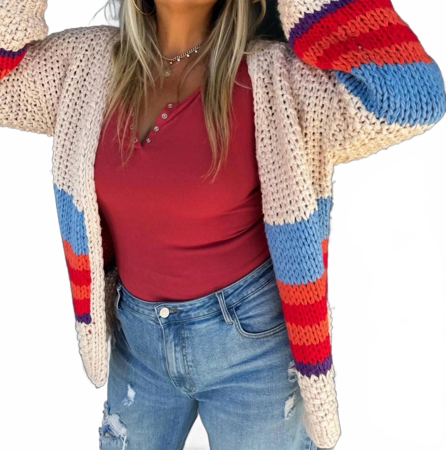 Идеально подходит для уличной моды осенью и путешествий. Женский кардиган с длинными рукавами-фонариками и V-образным вырезом. Изготовлен из эластичного акрила. Украшен модным полосатым узором и удобной застежкой-липучкой. Для сохранения приятной текстуры кардигана рекомендуется ручная стирка.