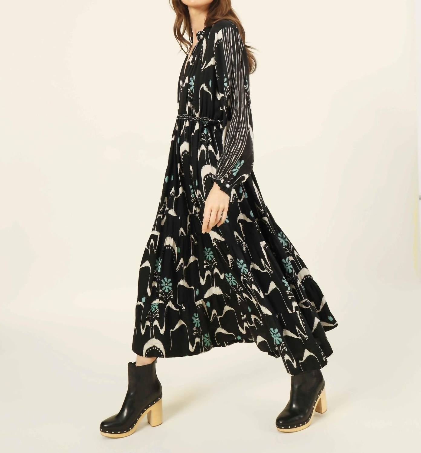Просто добавьте шлепанцы или мюли, и все готово. Ощутите вневременную элегантность в платье Misha Midi от OMIKA, шедевре в оттенке Samira Smokestack. Это платье А-силуэта с узором, выполненное из 100% модала, имеет длинные рукава и шикарный V-образный вырез с оборкой. Эластичный пояс и застежка на крючок обеспечивают комфорт и подчеркивают фигуру. Уход прост: машинная стирка и сушка на веревке.